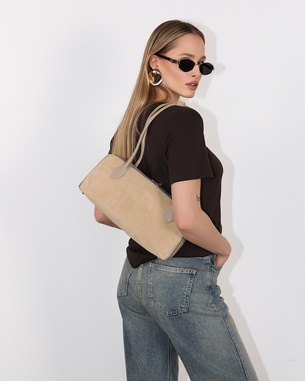 Beżowa torebka damska typu bagietka zamszowa na ramię