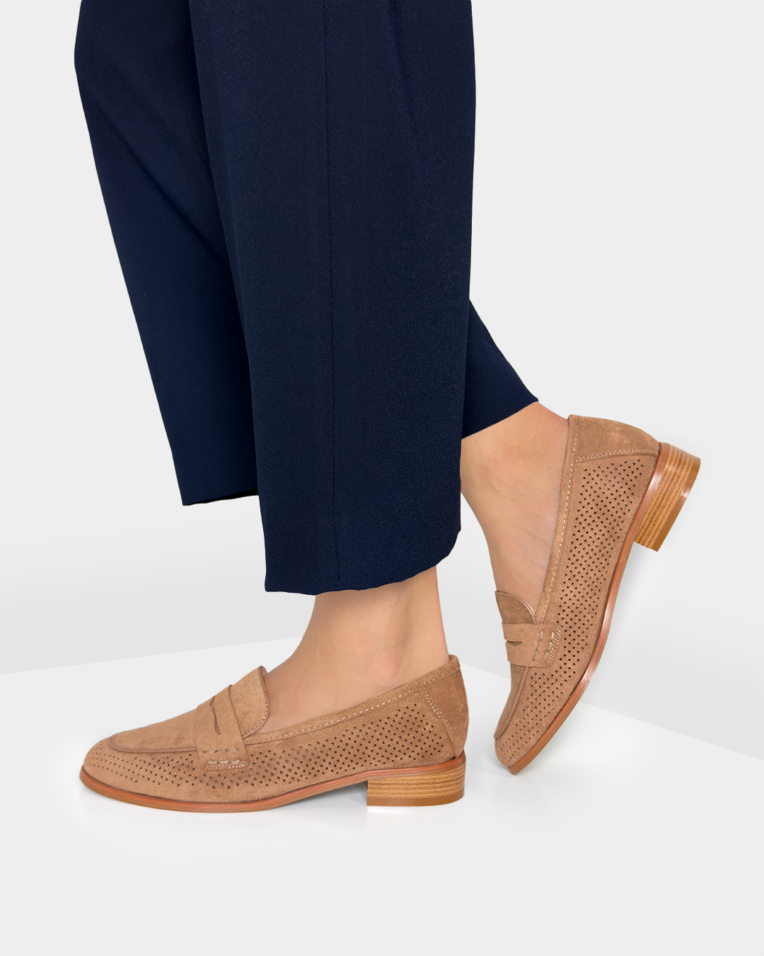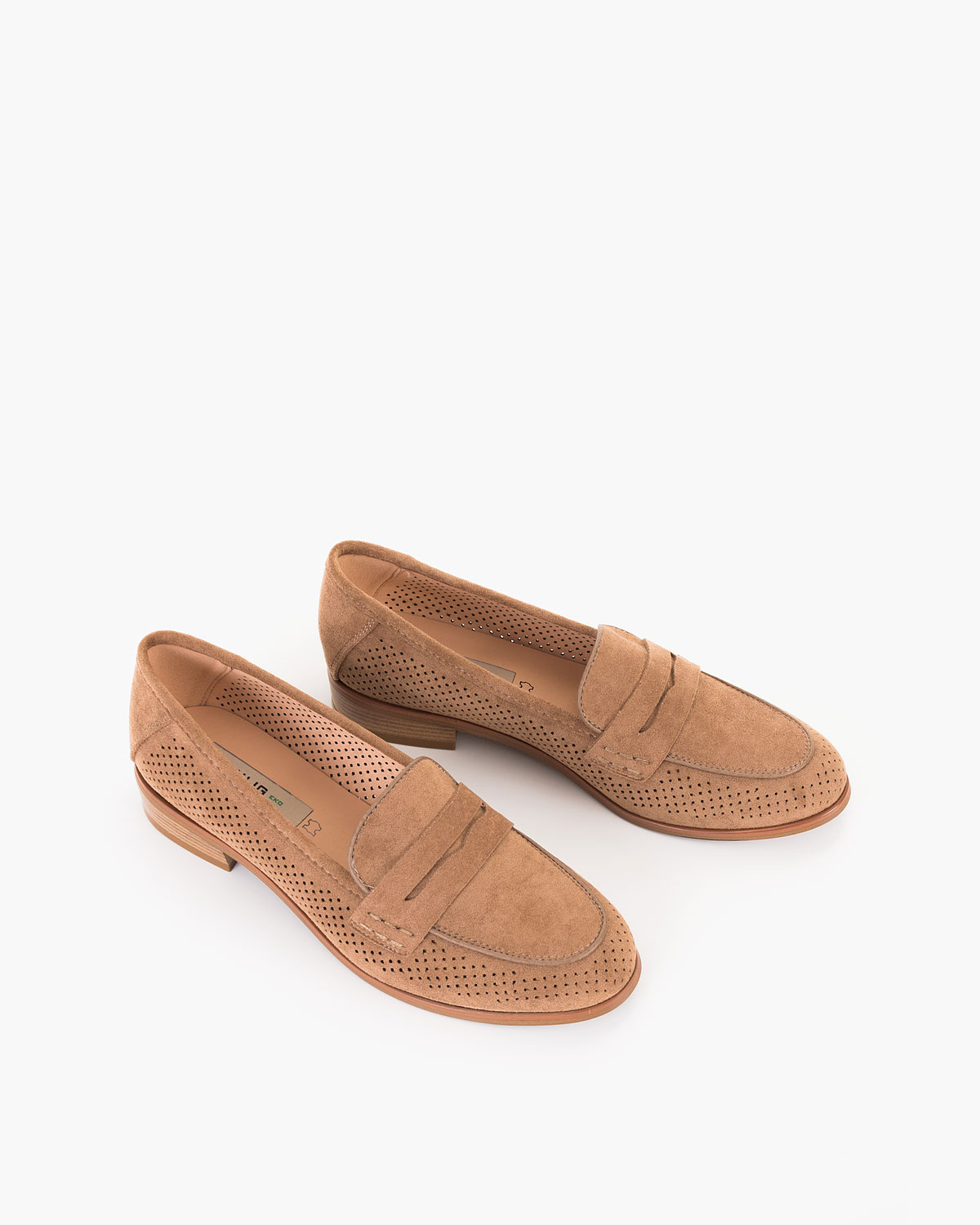 Beżowe mokasyny damskie ażurowe z eko-zamszu