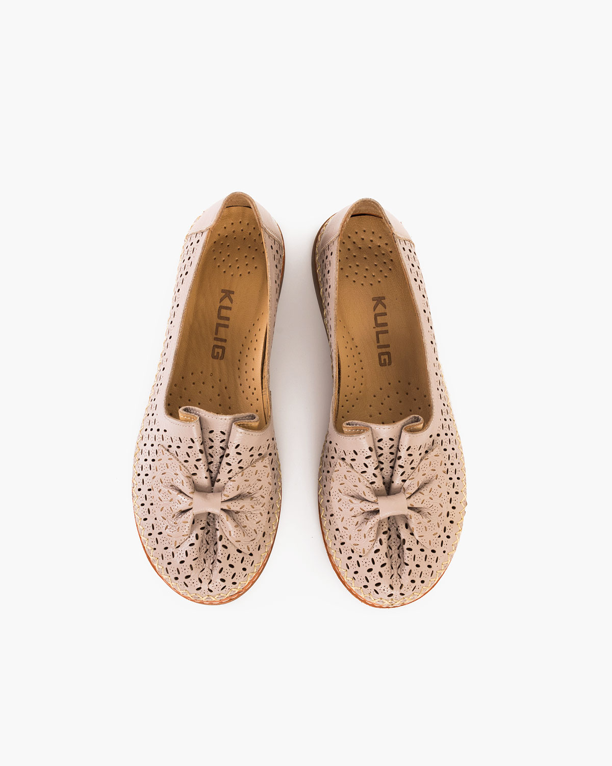 Beżowe półbuty damskie ażurowe ze skóry licowej z kokardą