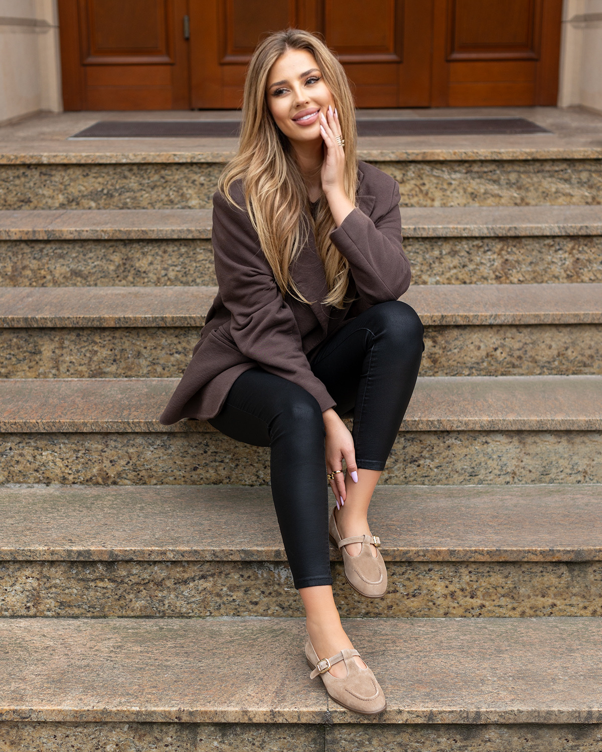 Brązowe półbuty damskie ze skóry zamszowej ze sprzączką
