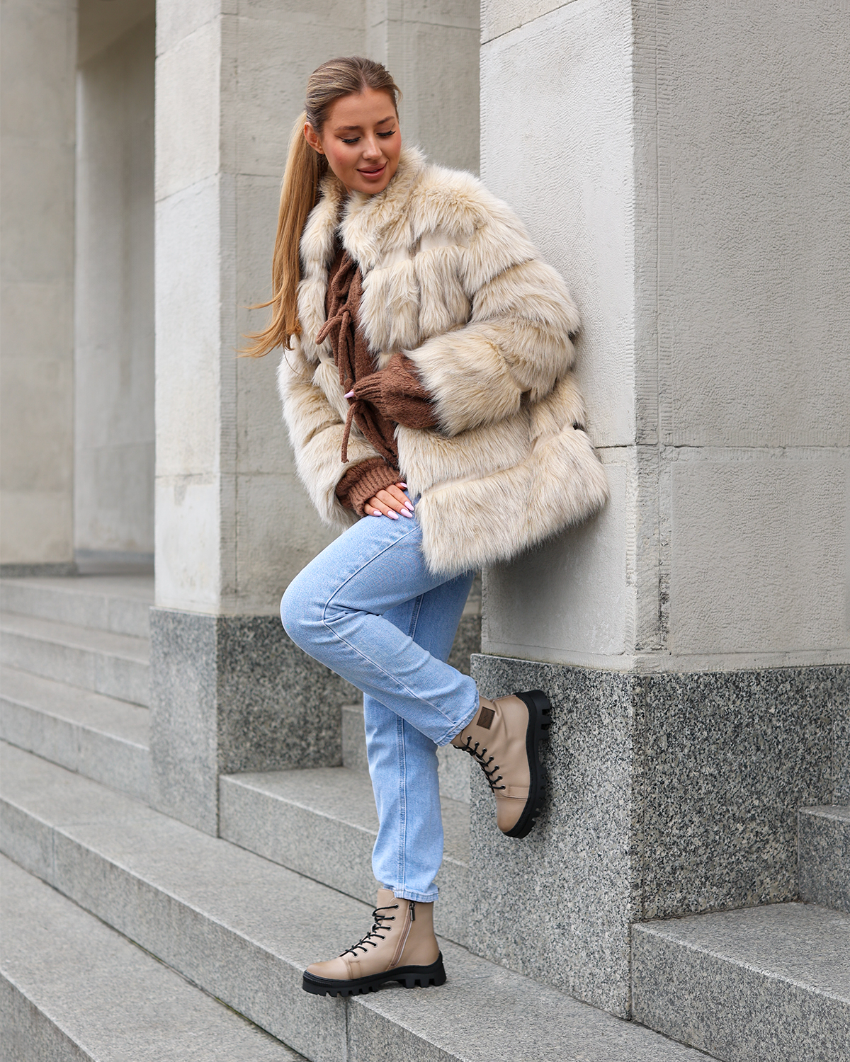 Beżowe śniegowce damskie ze skóry ekologicznej