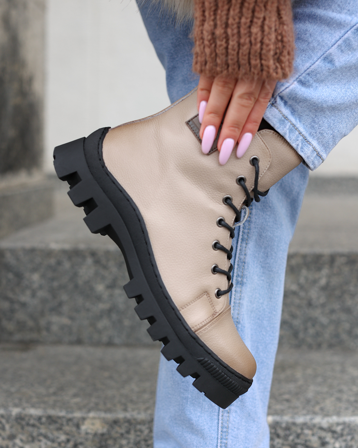 Beżowe trapery damskie sznurowane ze skóry licowej 139-07391-BEŻBeżowe trapery damskie sznurowane ze skóry licowej 139-07391-BEŻ