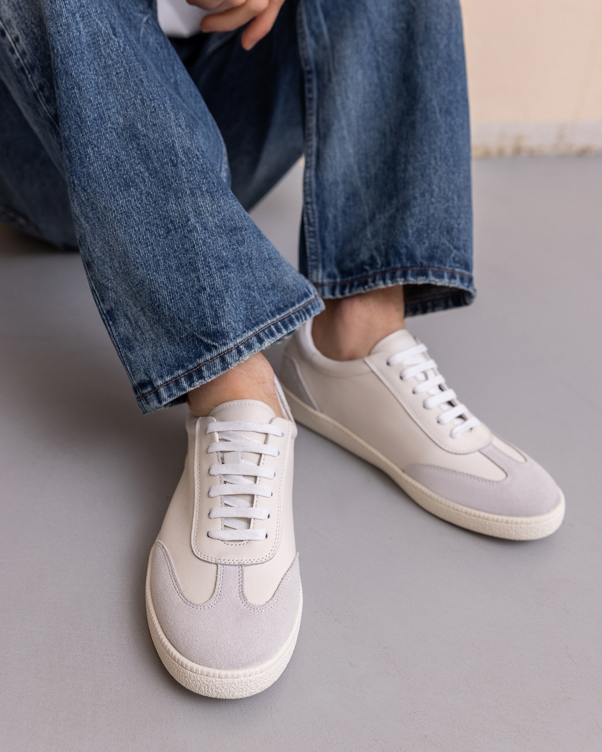 Biało-beżowe sneakersy męskie sznurowane ze skóry licowej