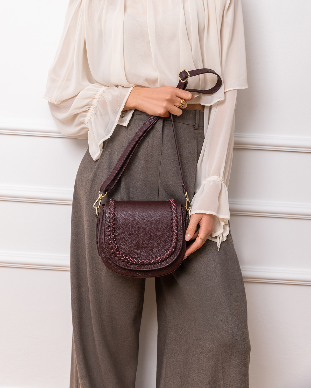 Bordowa mała torebka damska ze skóry licowej z warkoczem