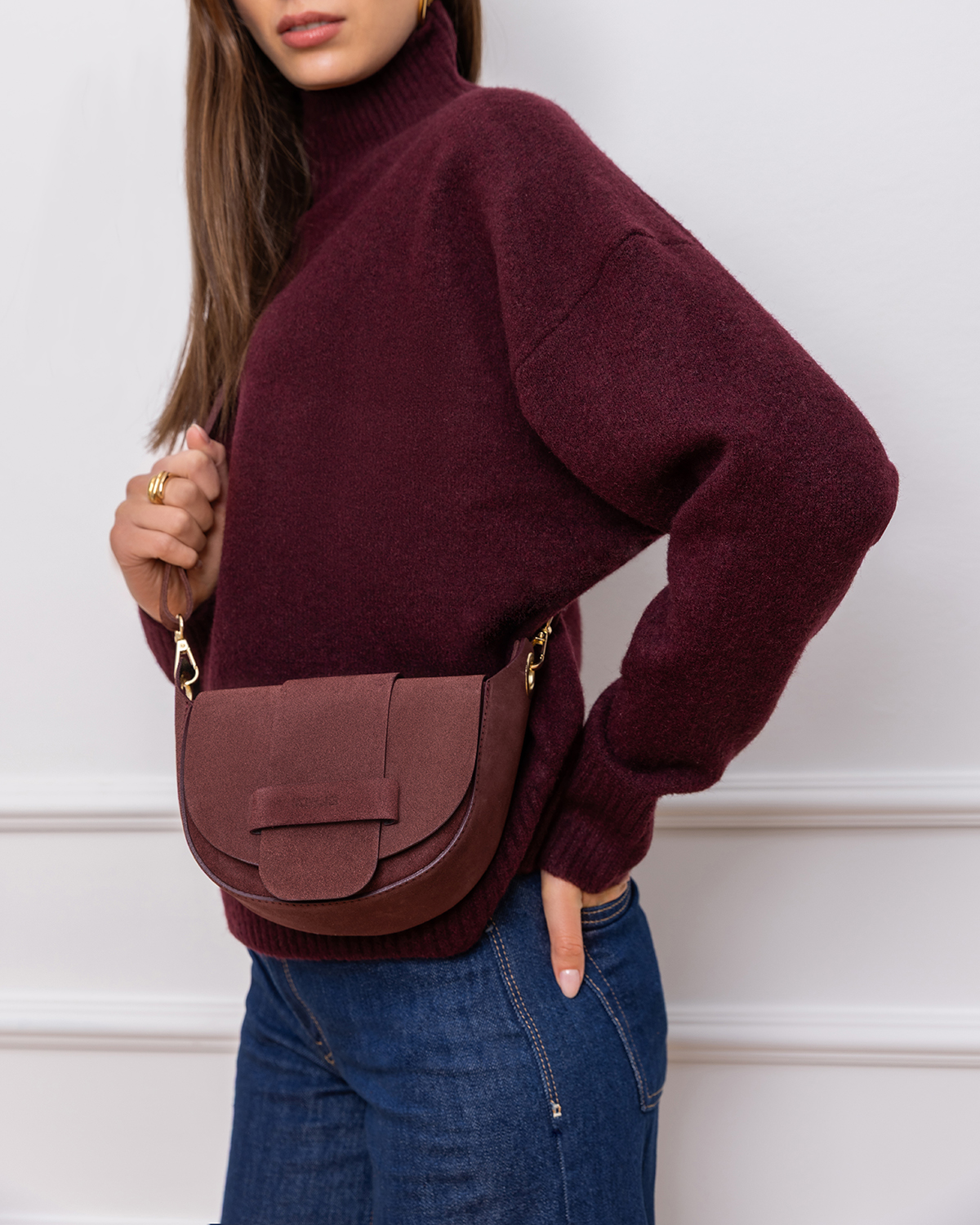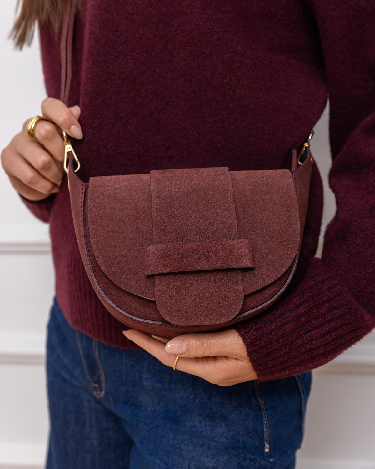 Bordowa mała torebka ze skóry zamszowej z klapką