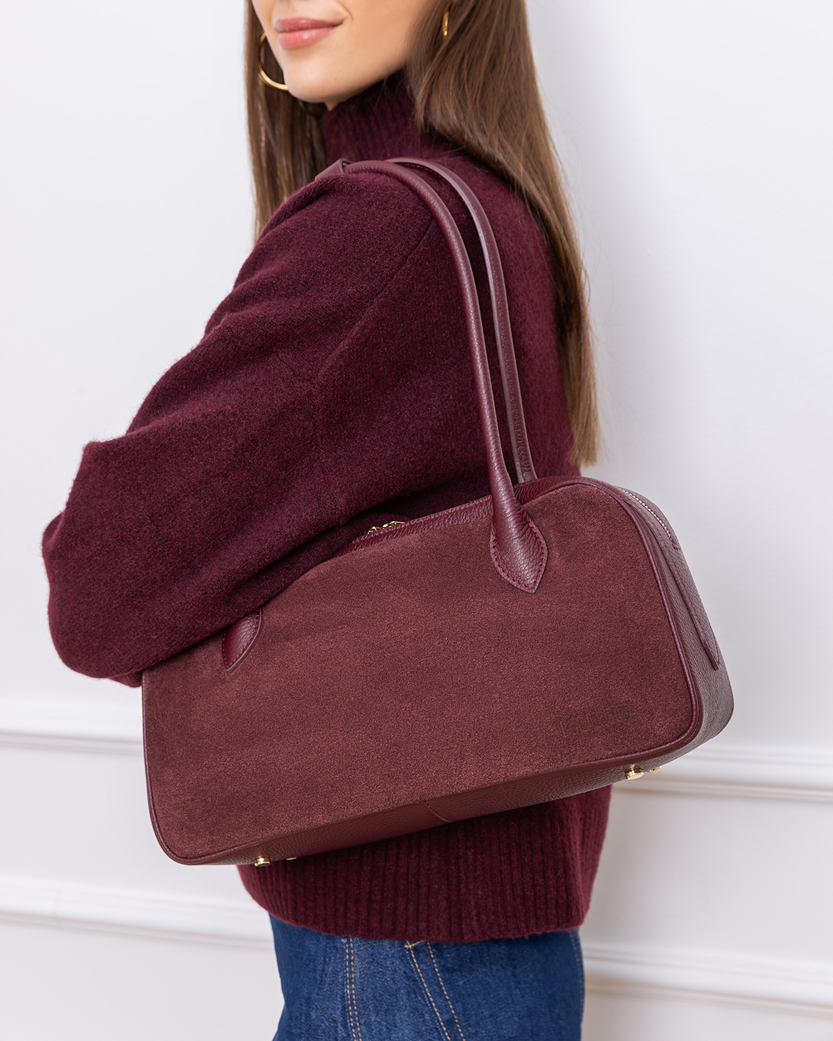 Bordowa torebka kuferek z naturalnej skóry zamszowej