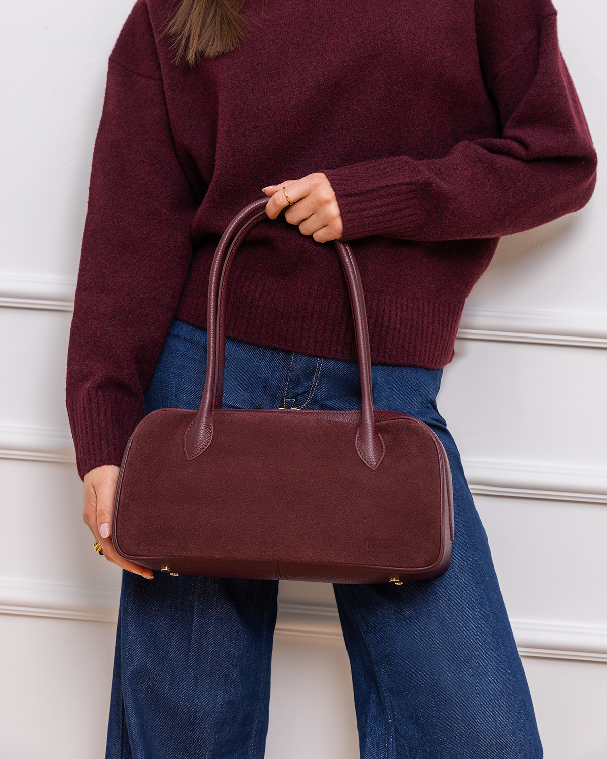 Bordowa torebka kuferek z naturalnej skóry to elegancki model, który łączy klasyczną formę z dopracowanymi detalami i szlachetnymi materiałami. Charakterystyczny kształt kuferka nadaje całości wyrazisty, ponadczasowy styl, który świetnie wpisuje się w garderobę kobiet ceniących estetykę premium. Głęboki bordowy kolor podkreśla luksusowy charakter torebki i sprawia, że doskonale komponuje się zarówno z jasnymi, jak i ciemniejszymi stylizacjami. Model wyróżnia się harmonijnym połączeniem gładkiej skóry licowej z miękką skórą zamszową na froncie i tyle, co nadaje mu niebanalnego wyglądu.