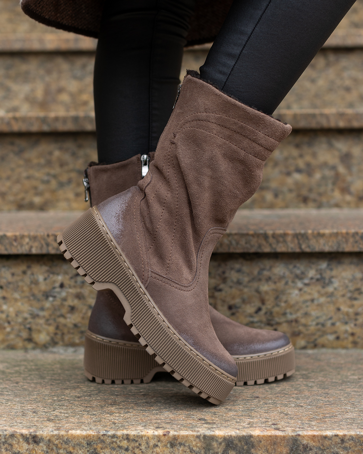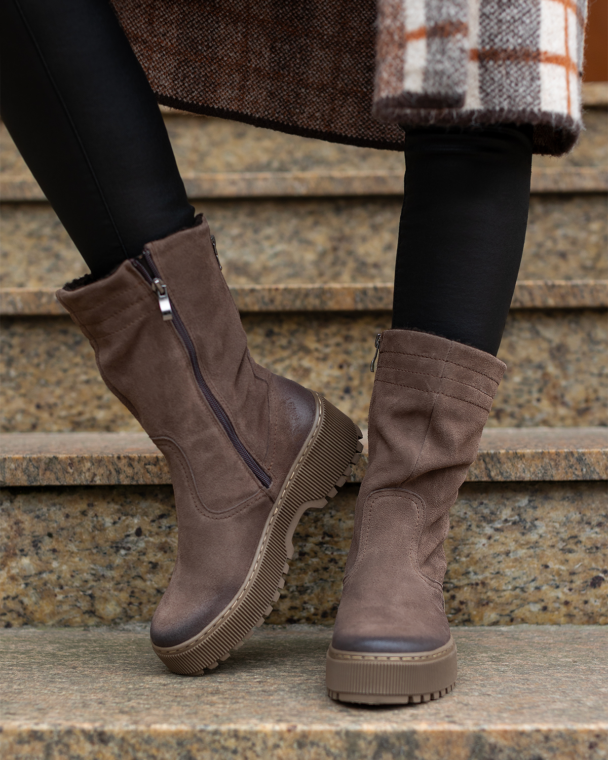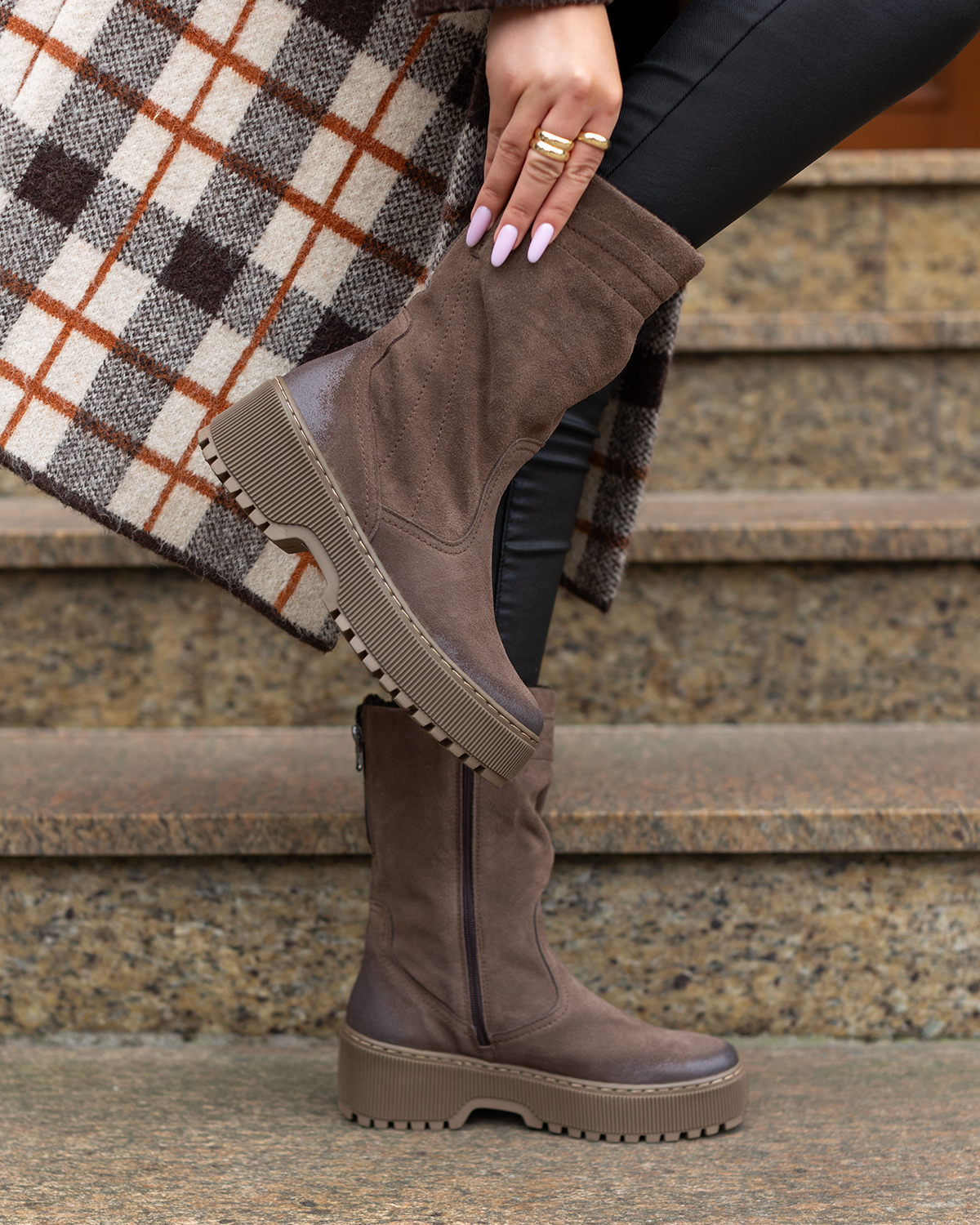 Botki wyróżniają się oryginalnym detalem w postaci dwóch suwaków – jeden umieszczony z boku ułatwia zakładanie, natomiast drugi z tyłu pełni funkcję dekoracyjną, dodając modelowi subtelnego charakteru. Zaokrąglony nosek optycznie wysmukla stopę, a cholewka o wysokości 23 cm pięknie układa się na nodze, zapewniając wygodę i ciepło w chłodniejsze dni.