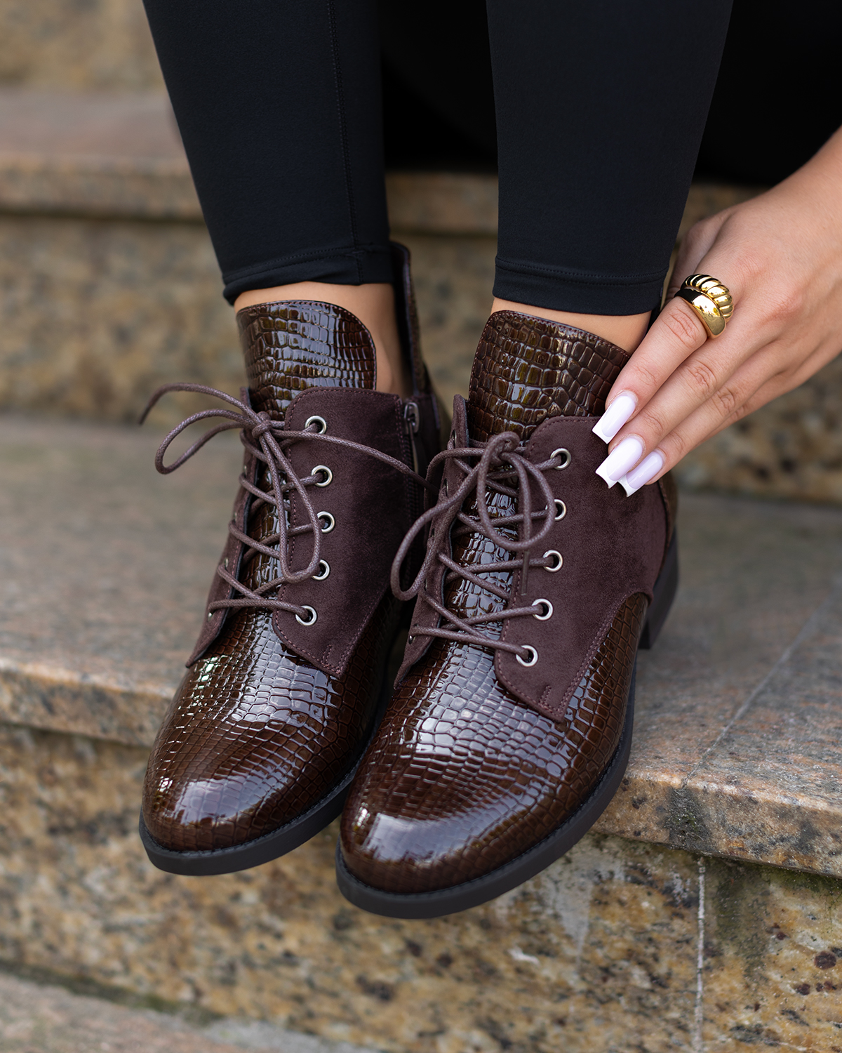 Brązowe botki sznurowane ze skóry ekologicznej na obcasie