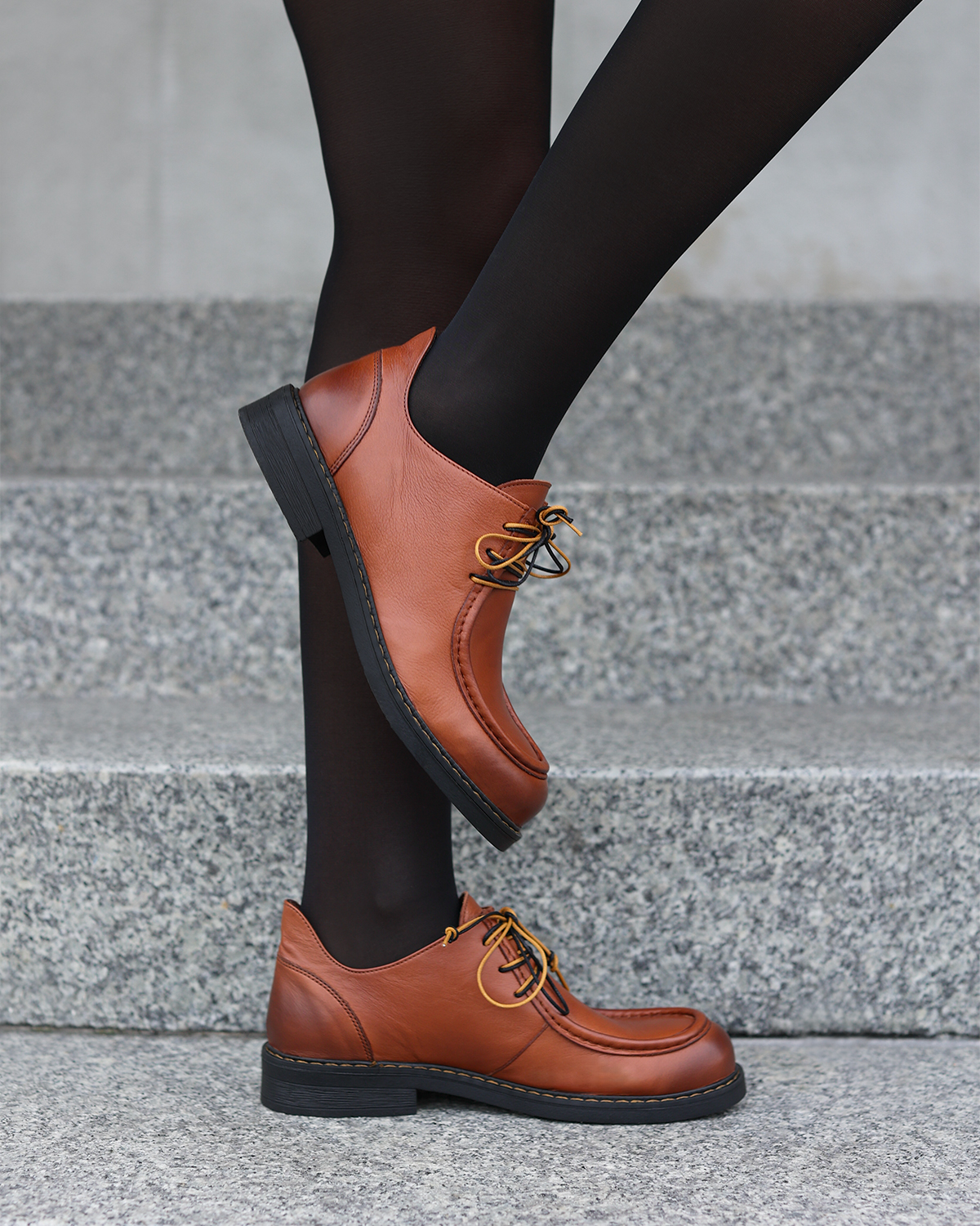 Brązowe półbuty damskie skórzane na niskim obcasie