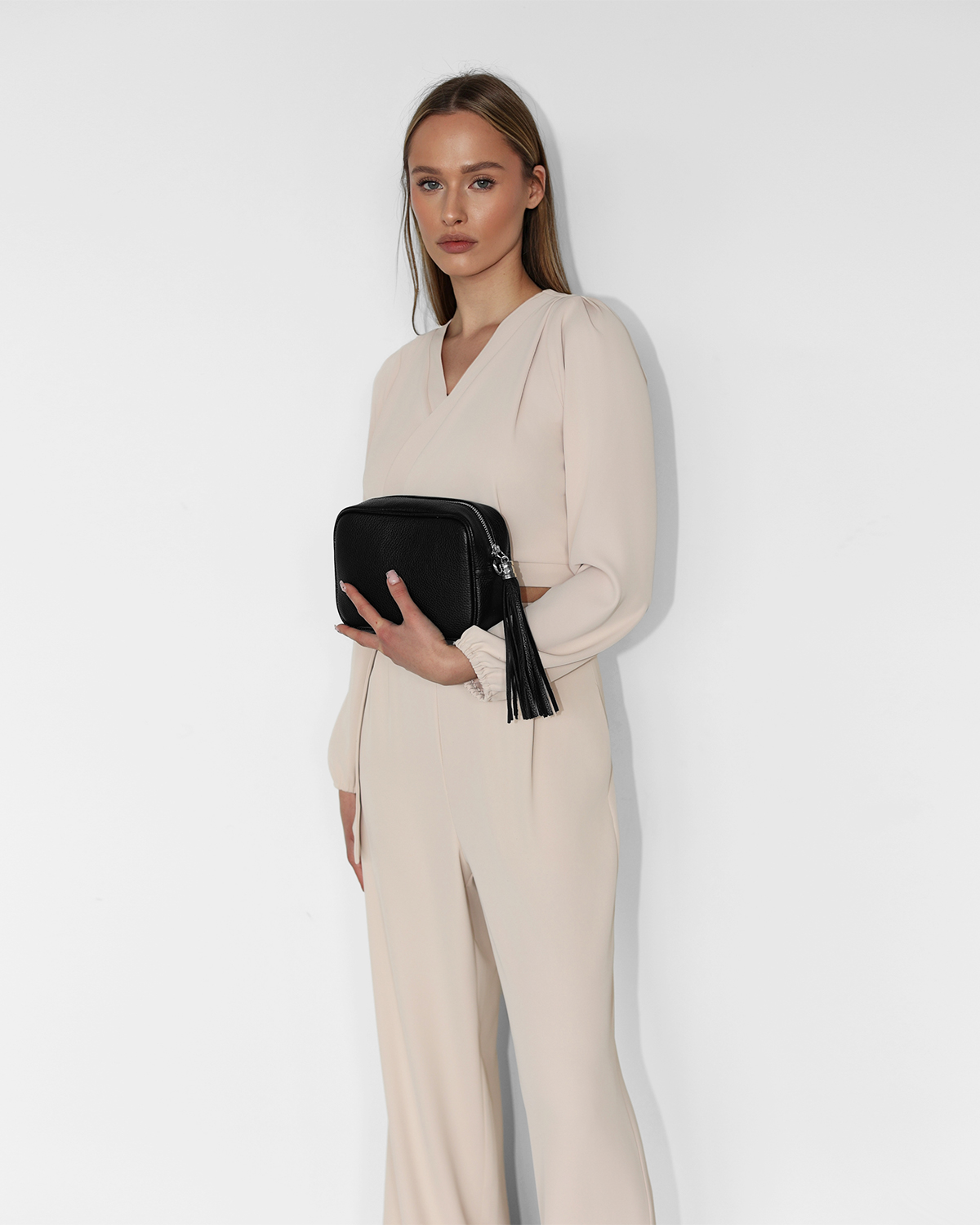 Czarna listonoszka damska ze skóry licowej z frędzlem