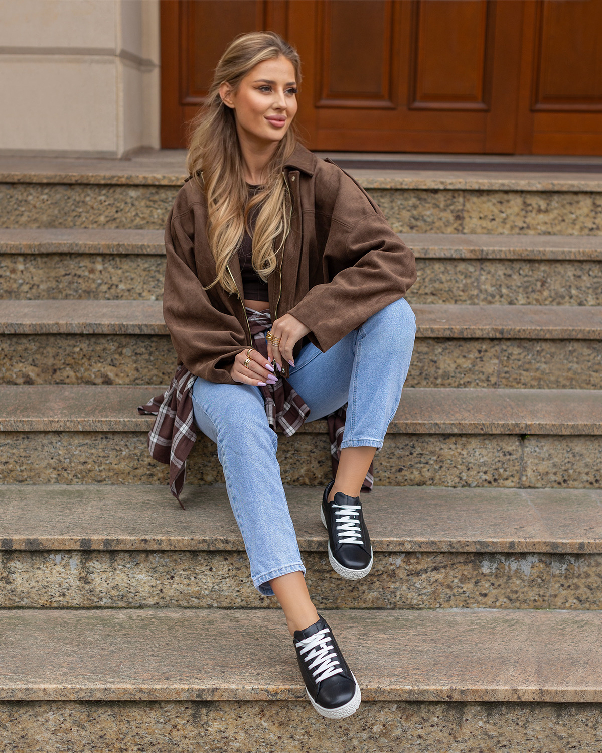 Czarne trampki damskie sznurowane ze skóry zamszowej