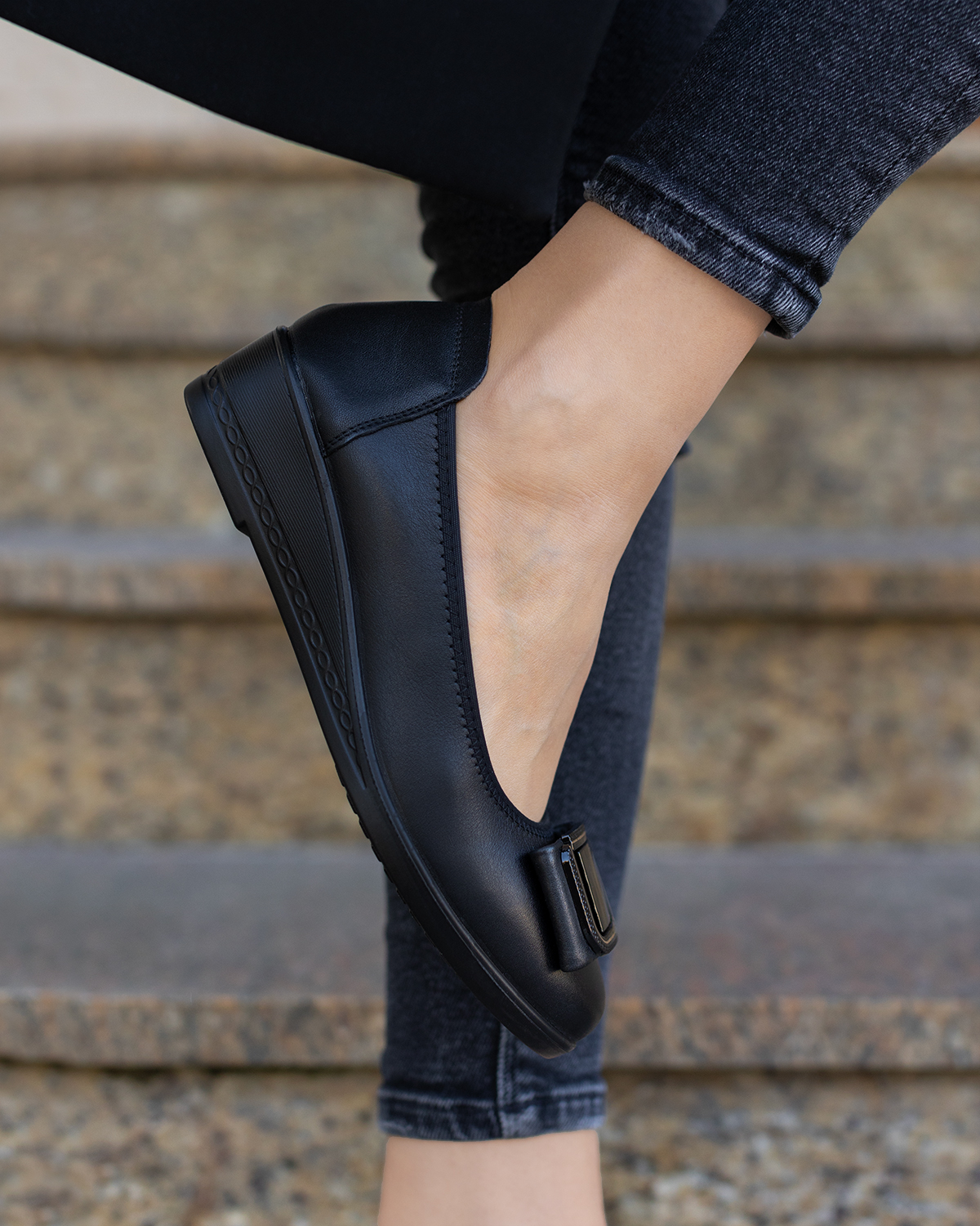 Czarne baleriny damskie skórzane na koturnie z ozdobą 057-8-5200-CZARCzarne baleriny damskie skórzane na koturnie z ozdobą 057-8-5200-CZAR