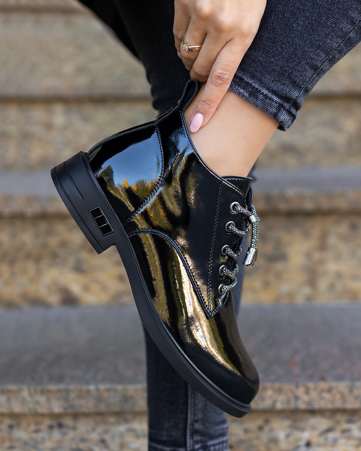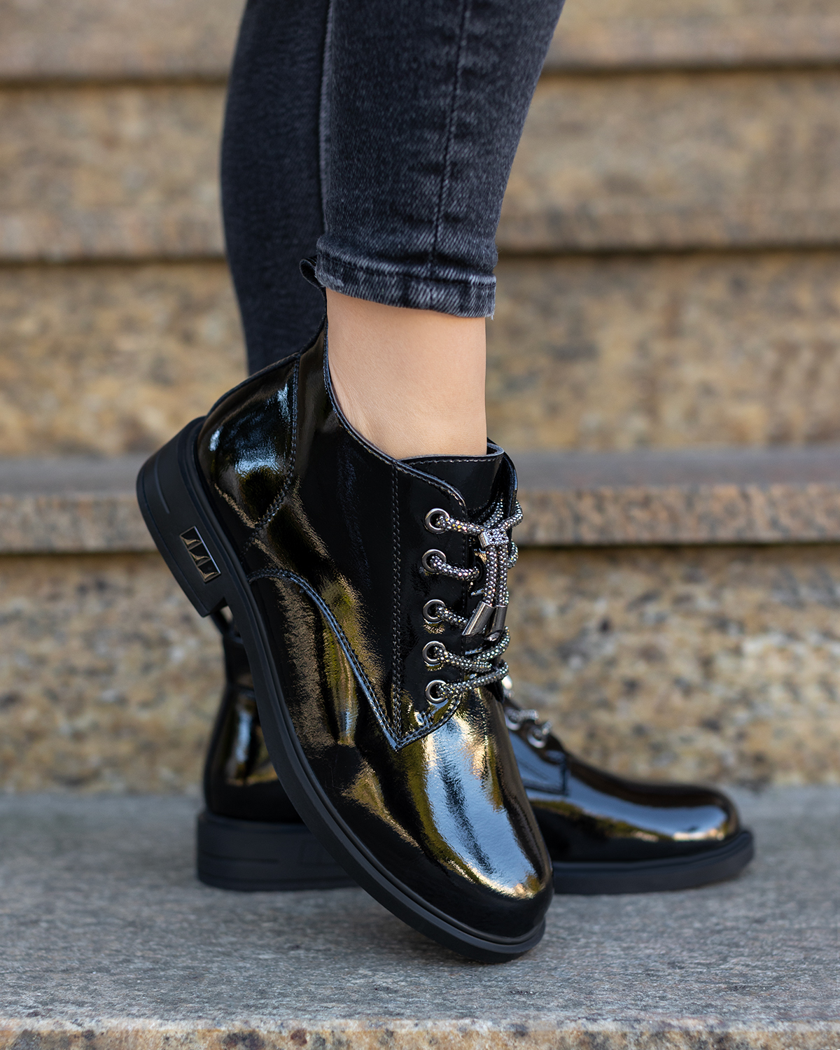 Czarne botki damskie sznurowane ze skóry lakierowanej