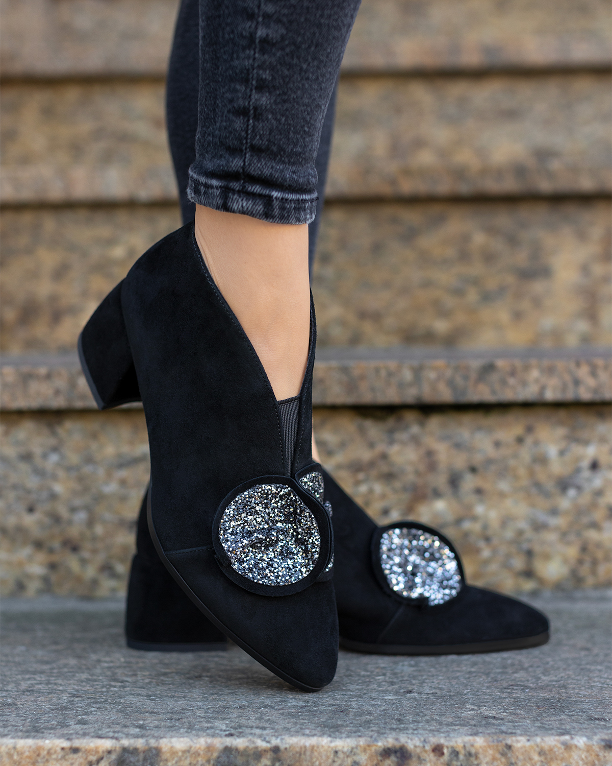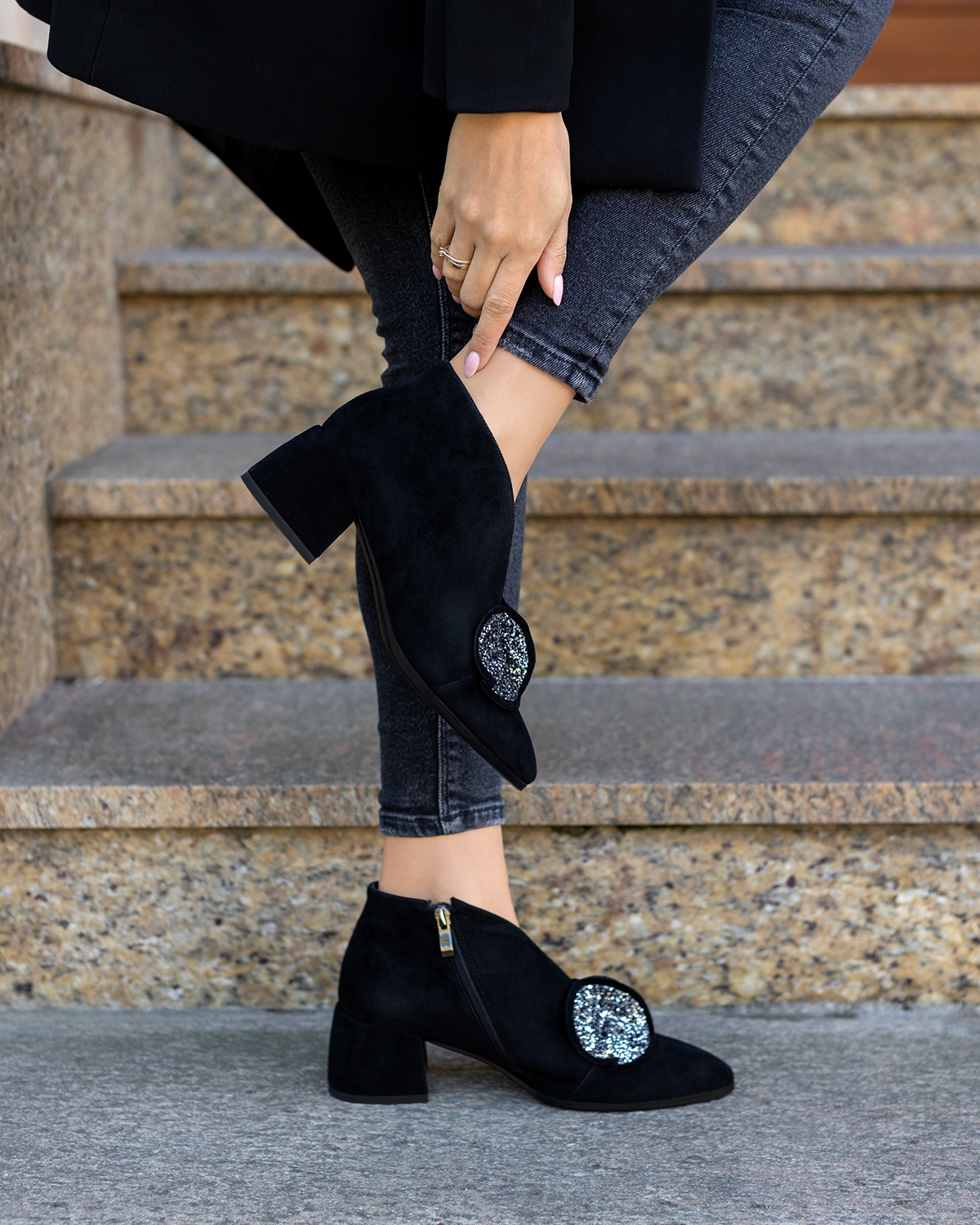 Czarne botki damskie zamszowe na klocku z ozdobą 131-25-281-MIXCzarne botki damskie zamszowe na klocku z ozdobą 131-25-281-MIX