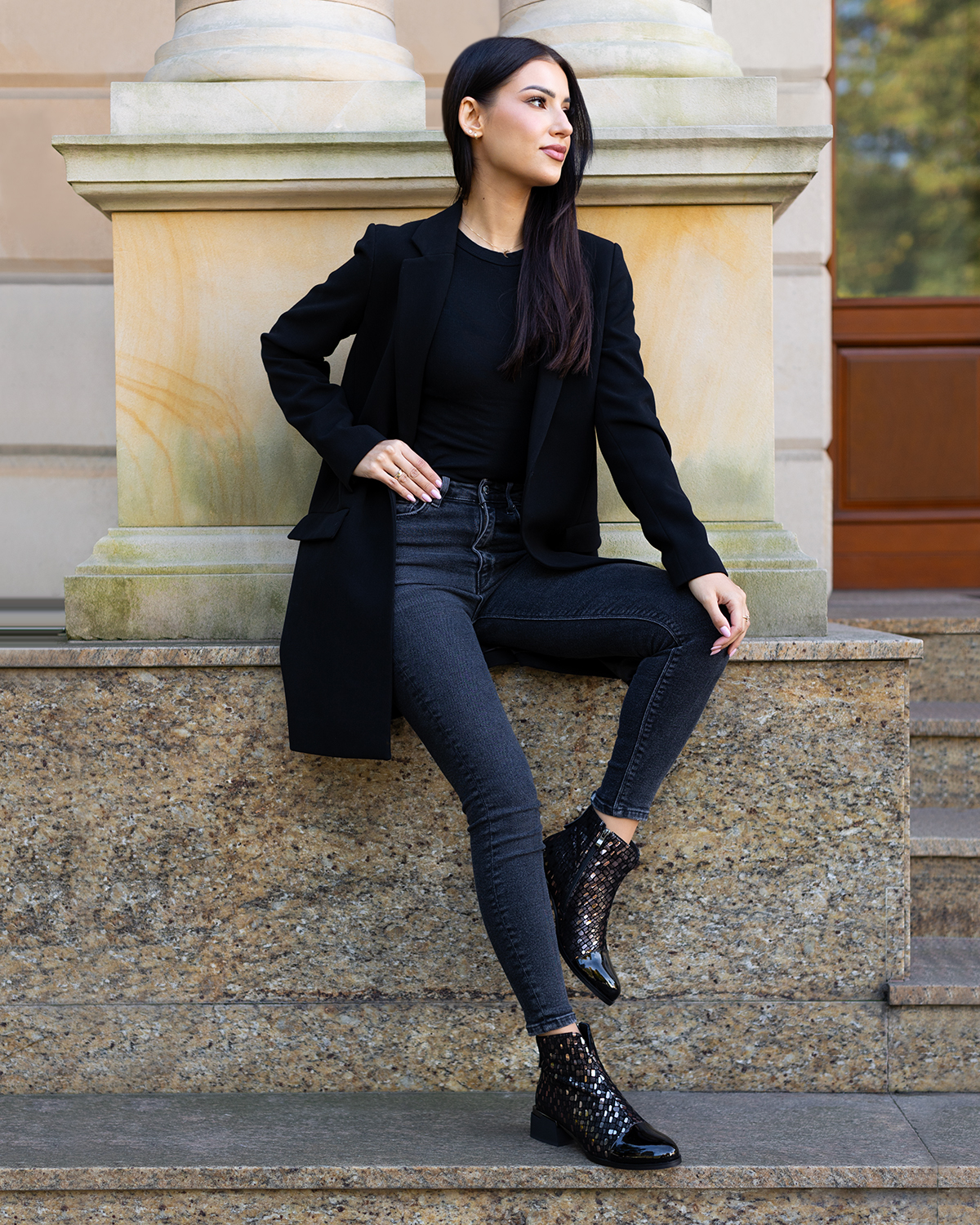 Czarne botki damskie ze skóry naturalnej na słupku z motywem 131-25-251-CZARNCzarne botki damskie ze skóry naturalnej na słupku z motywem 131-25-251-CZARN
