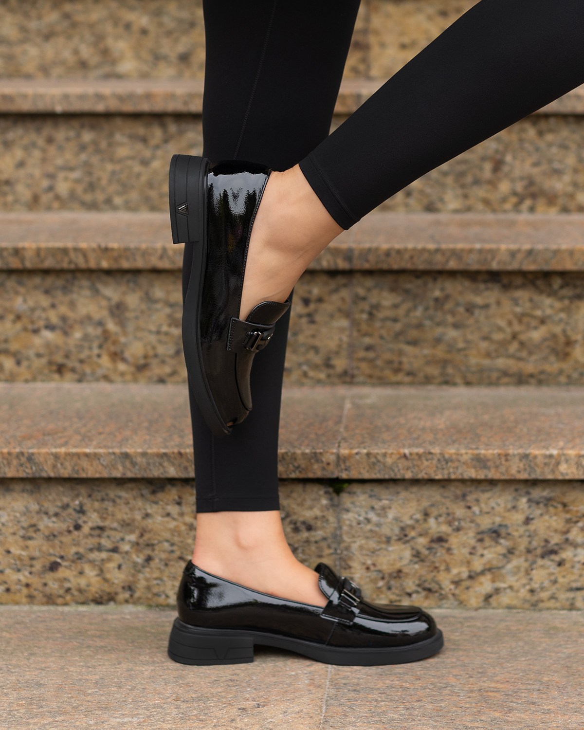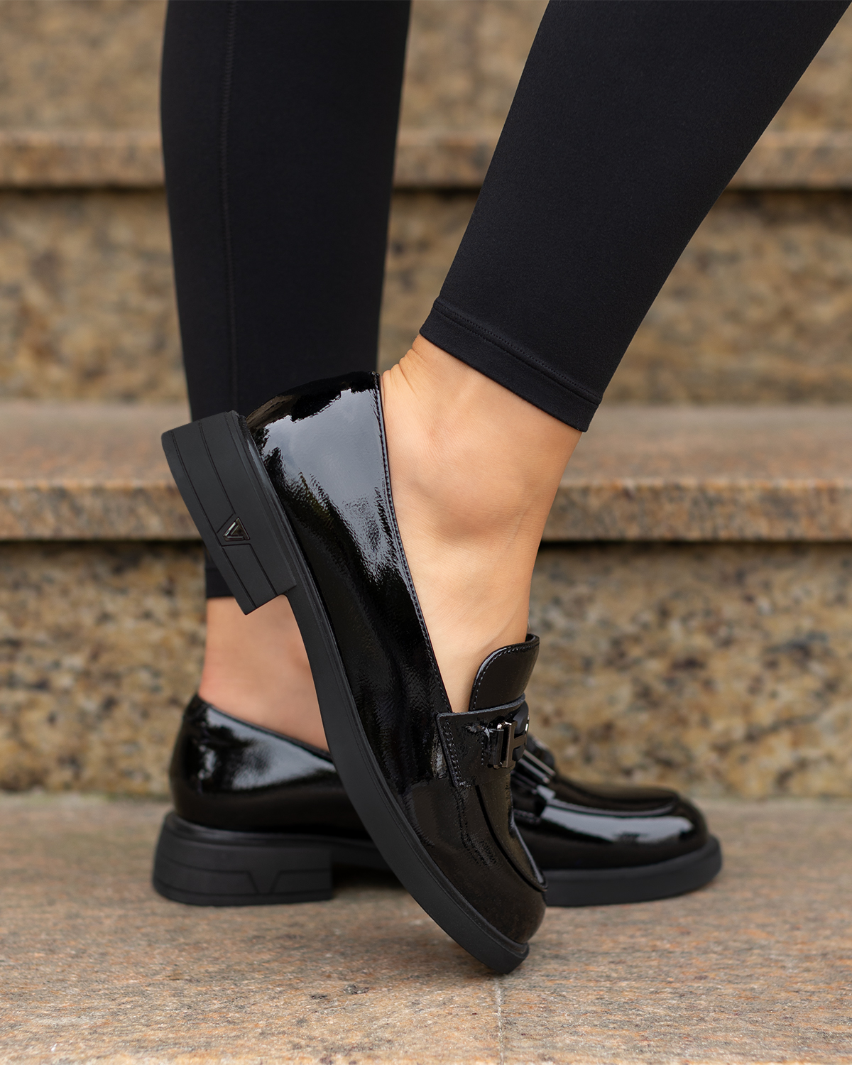 Czarne mokasyny damskie ze skóry lakierowanej z klamrą 105-85993-CZARNYCzarne mokasyny damskie ze skóry lakierowanej z klamrą 105-85993-CZARNY