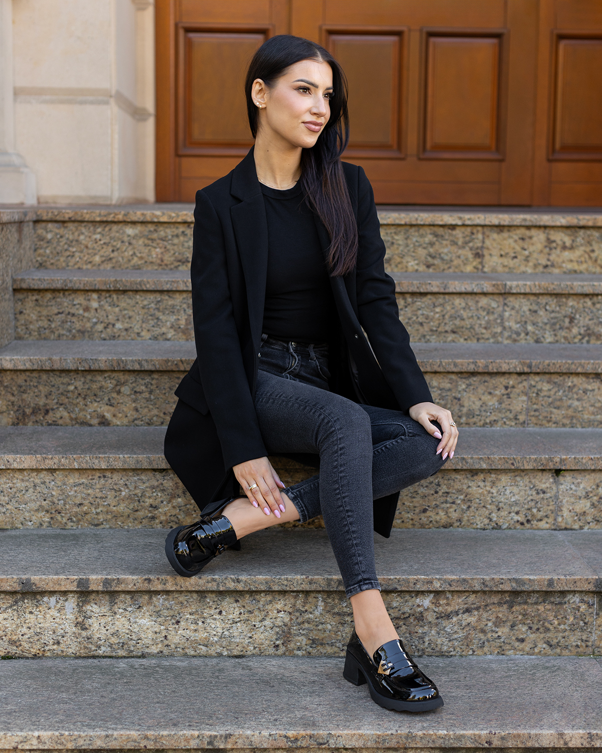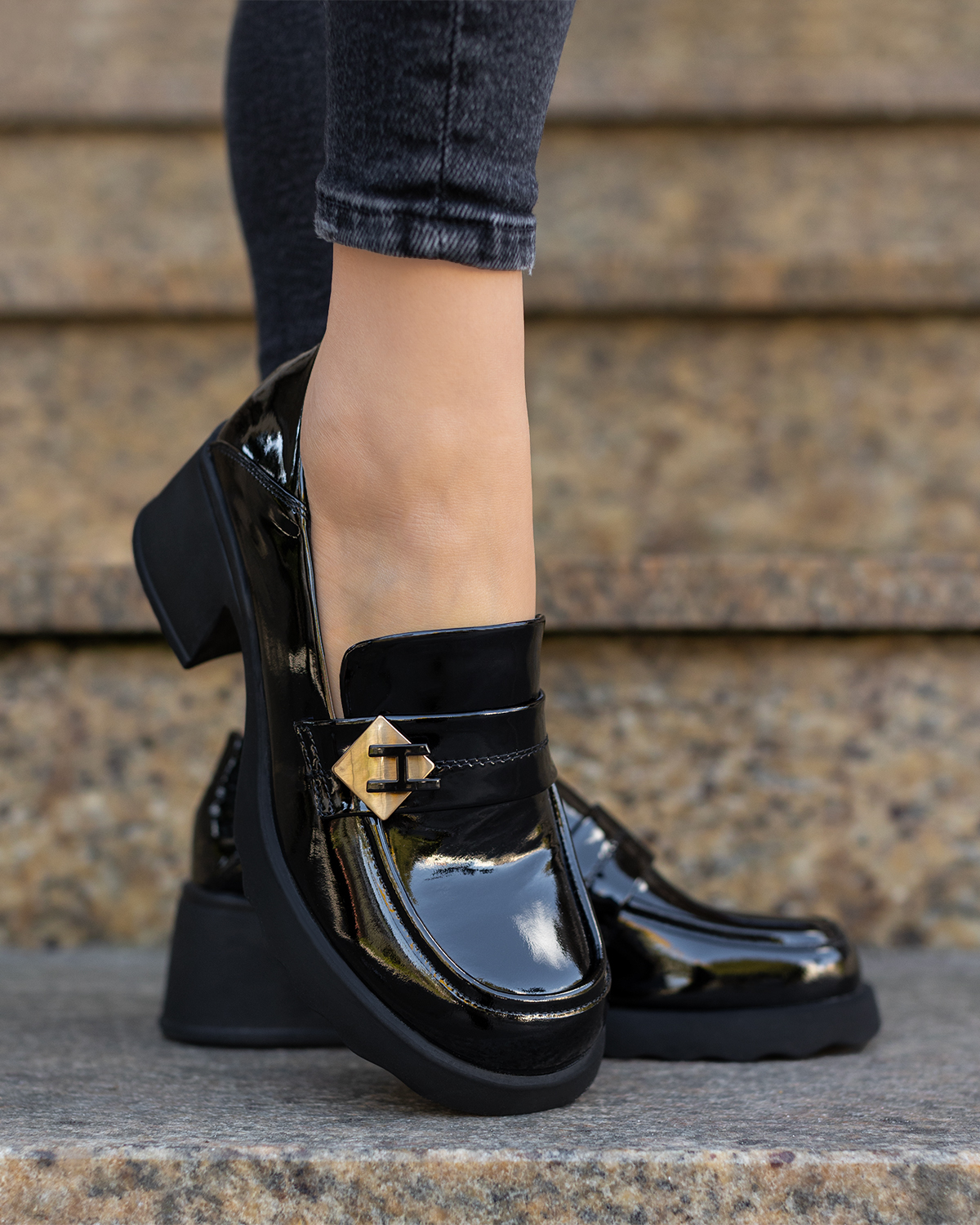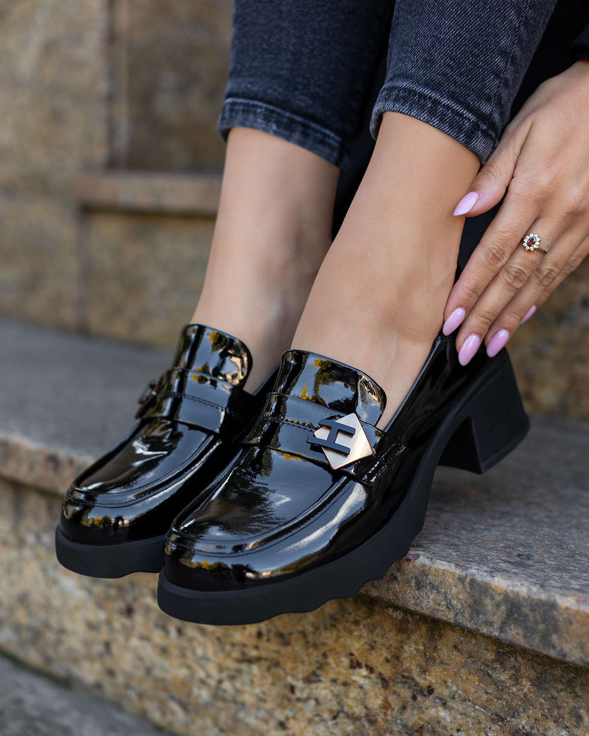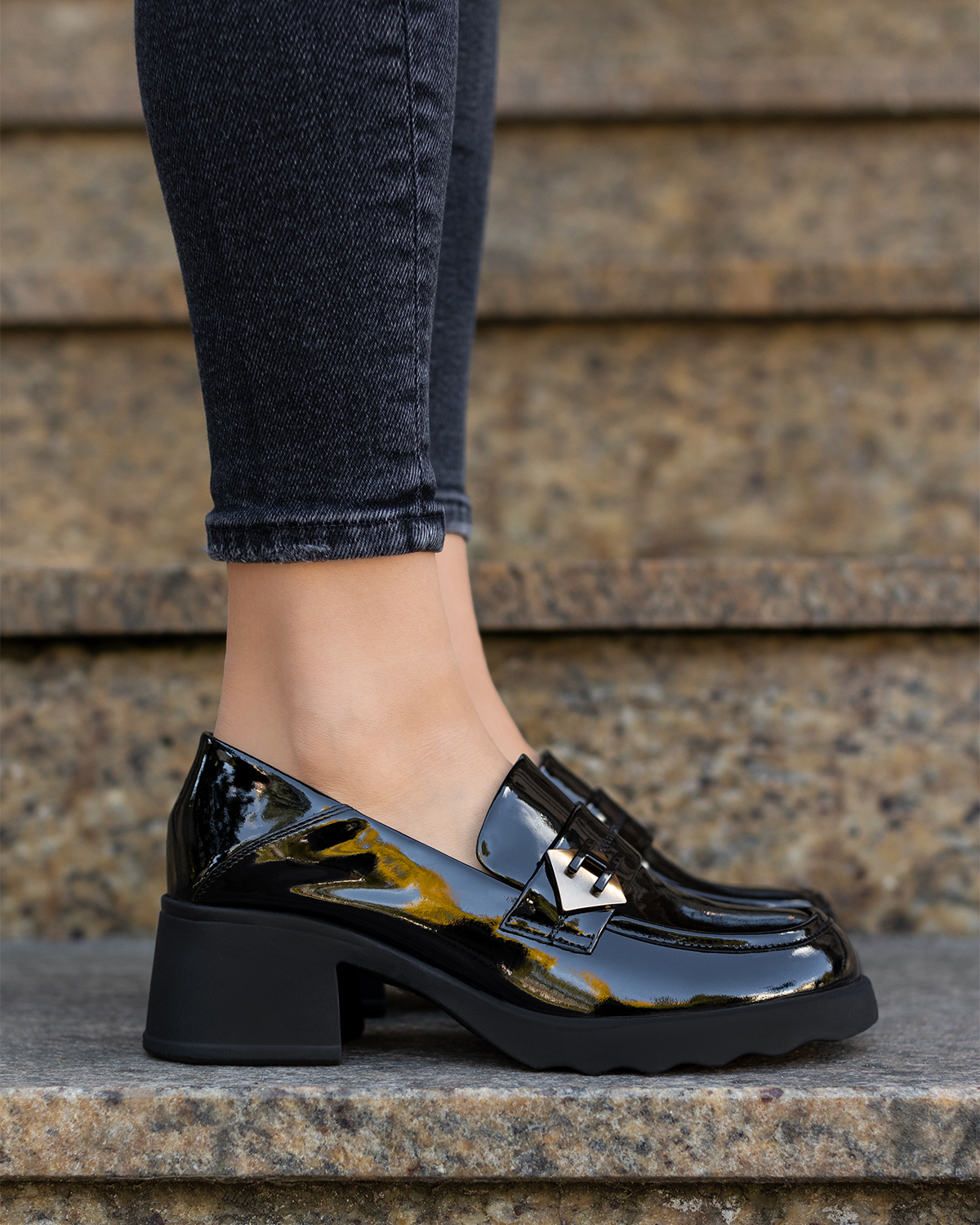 Czarne mokasyny damskie ze skóry lakierowanej na klocku 057-6-5200-CZ-LACzarne mokasyny damskie ze skóry lakierowanej na klocku 057-6-5200-CZ-LA