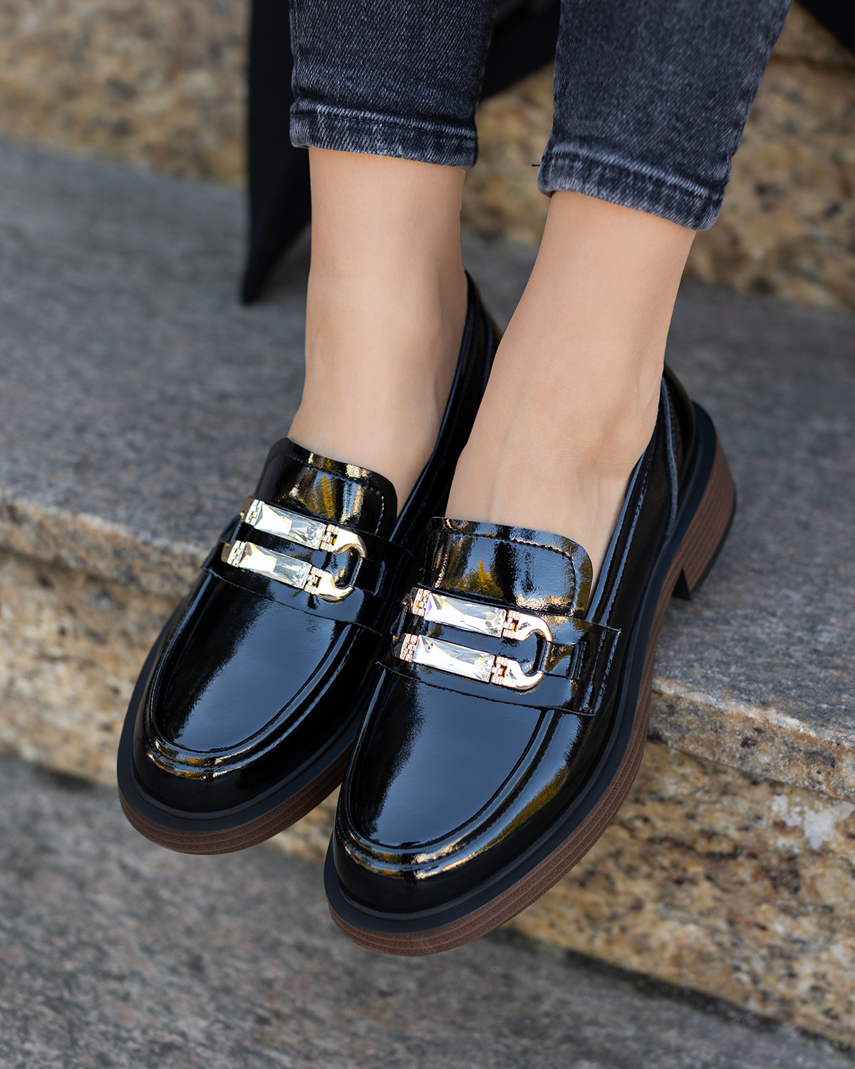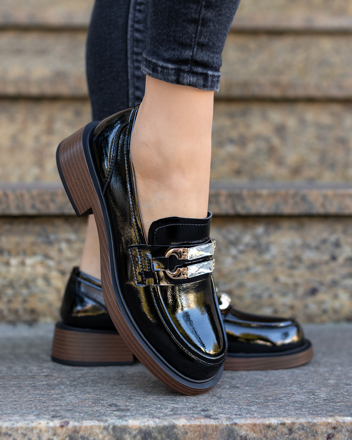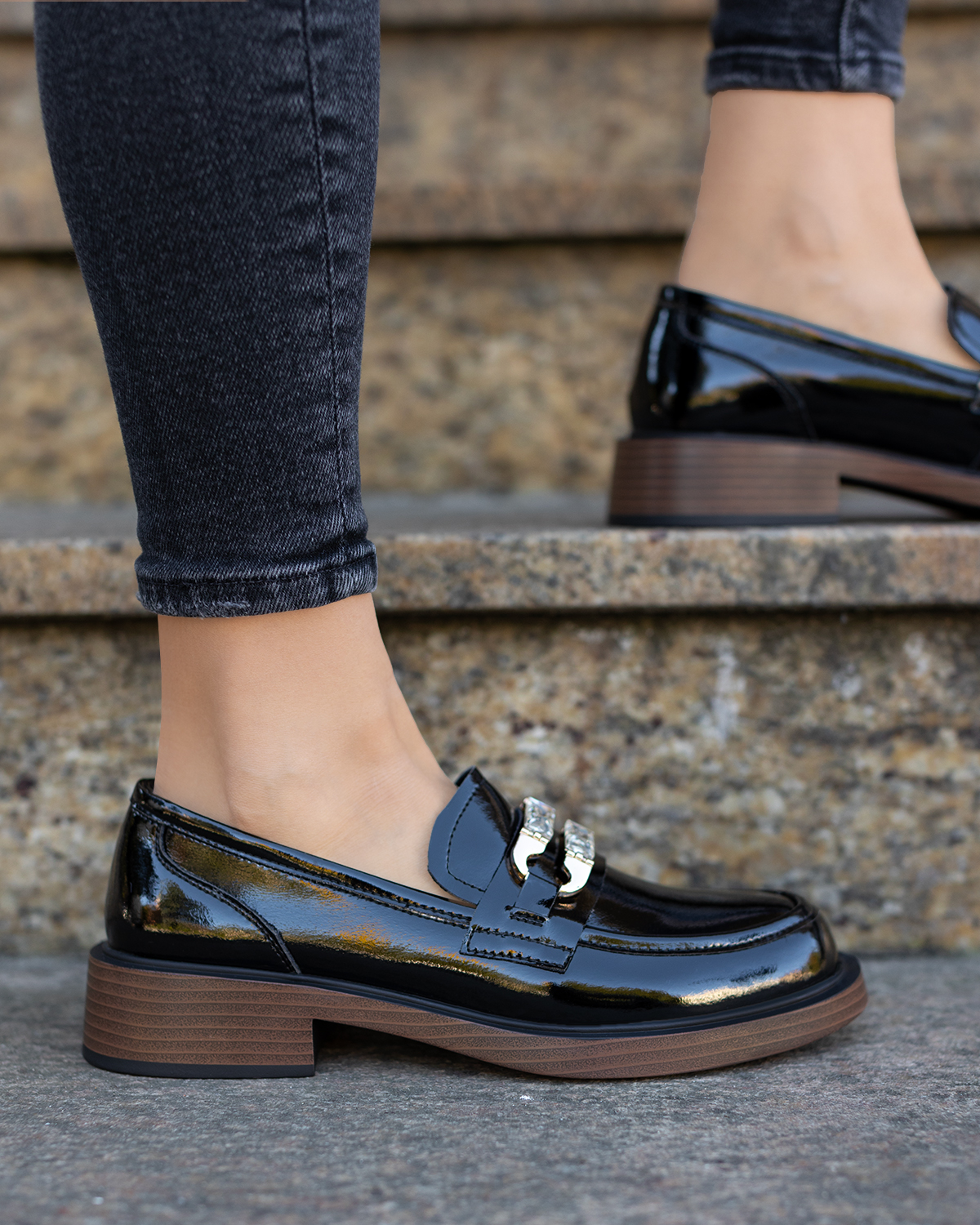 Czarne mokasyny damskie ze skóry lakierowanej na klocku 131-25-271-CZARNCzarne mokasyny damskie ze skóry lakierowanej na klocku 131-25-271-CZARN