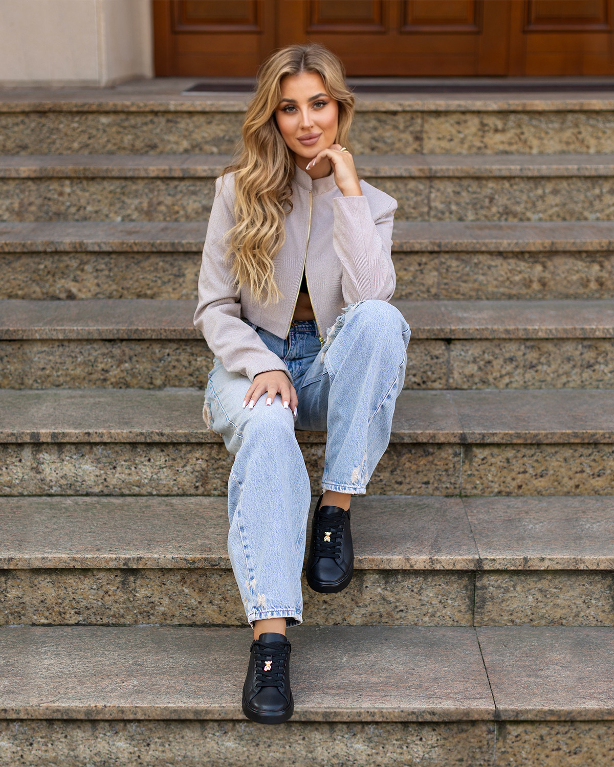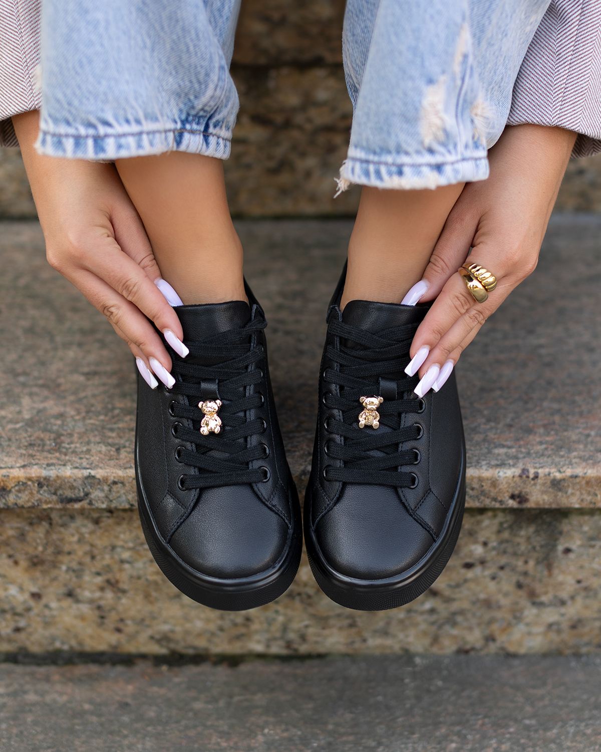 Czarne półbuty damskie wykonane z wysokogatunkowej skóry licowej to nowoczesna propozycja dla kobiet, które lubią łączyć miejski styl z nutą elegancji. Ich klasyczny odcień czerni sprawia, że pasują do każdej stylizacji – zarówno do jeansów i bluzy, jak i do bardziej kobiecych zestawień. Delikatny połysk skóry nadaje im ekskluzywny wygląd, a charakterystycznym akcentem jest efektowna zawieszka w kształcie misia umieszczona przy sznurowadłach. Ten modny detal dodaje całości oryginalności i podkreśla indywidualny charakter obuwia.