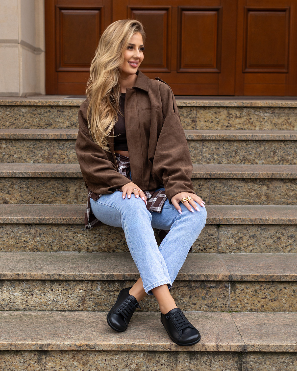 Czarne trampki damskie sznurowane ze skóry zamszowej
