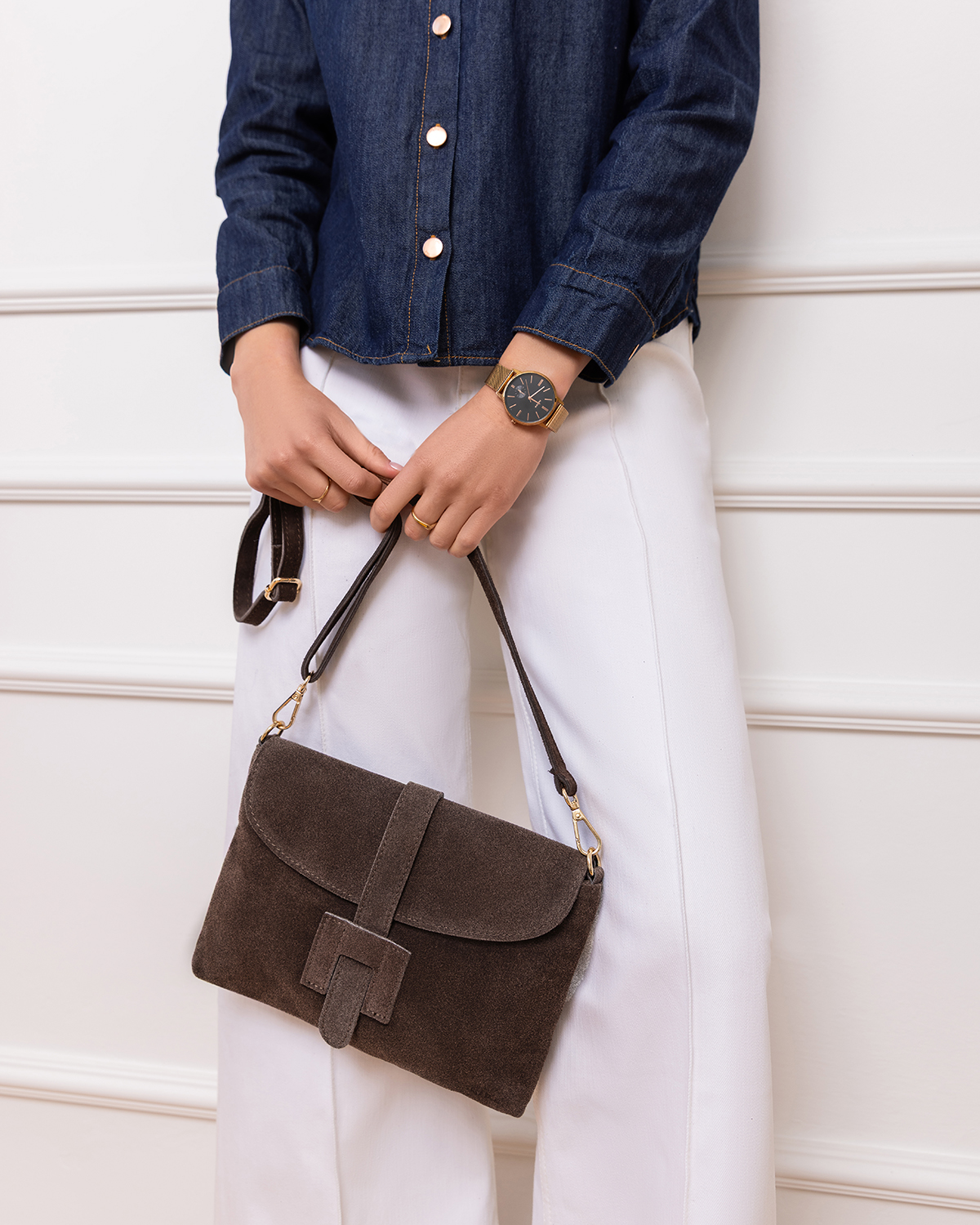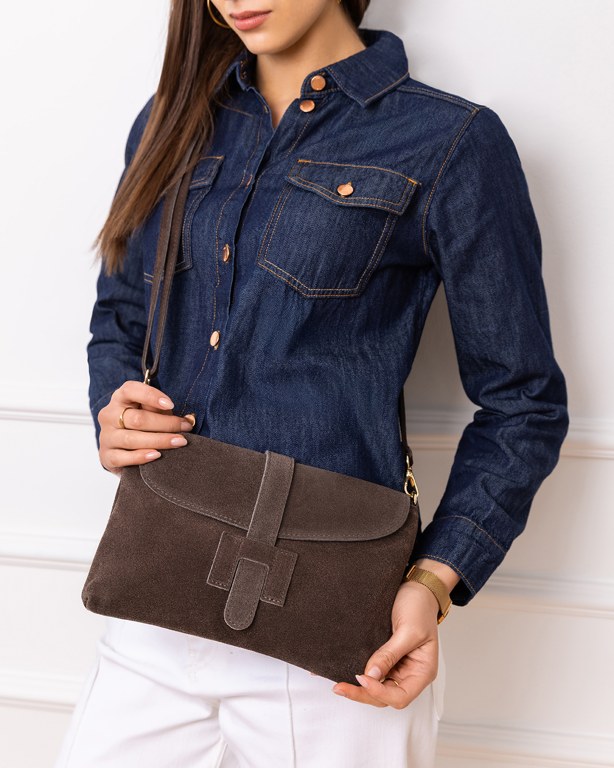 Czekoladowa mała torebka damska ze skóry zamszowej z paskiem