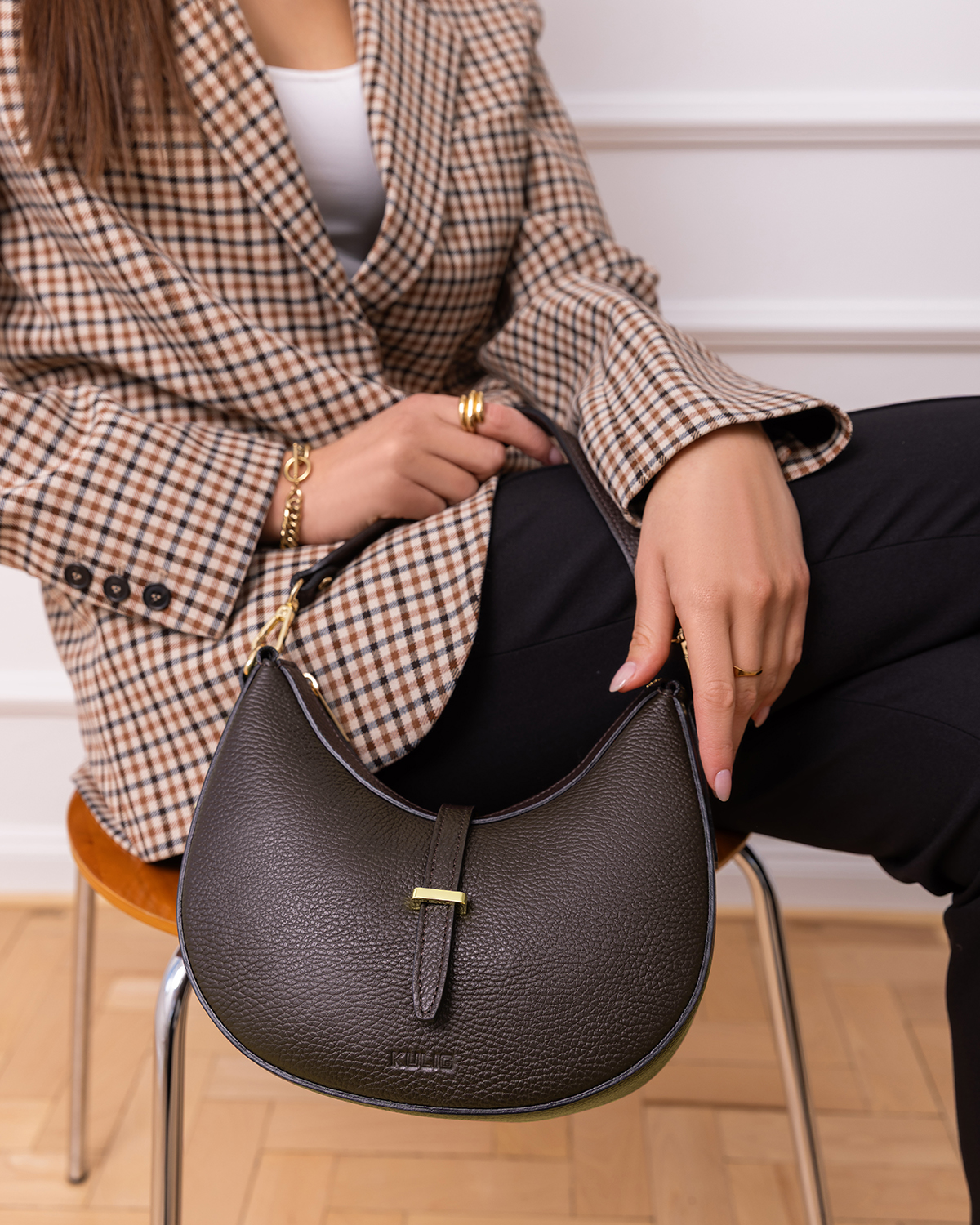 Czekoladowa mała torebka hobo ze skóry licowej z klamrą