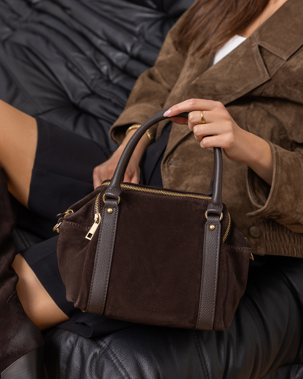 Czekoladowa torebka kuferek ze skóry zamszowej