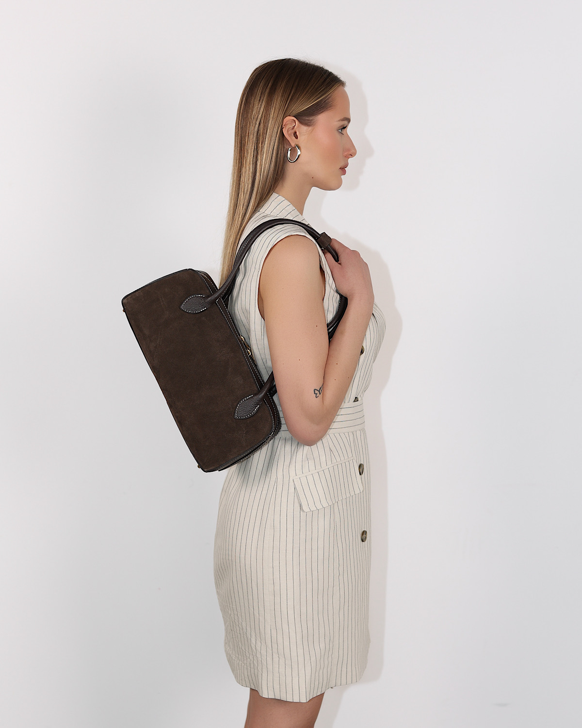 Czekoladowa torebka damska podłużna ze skóry zamszowej na ramię