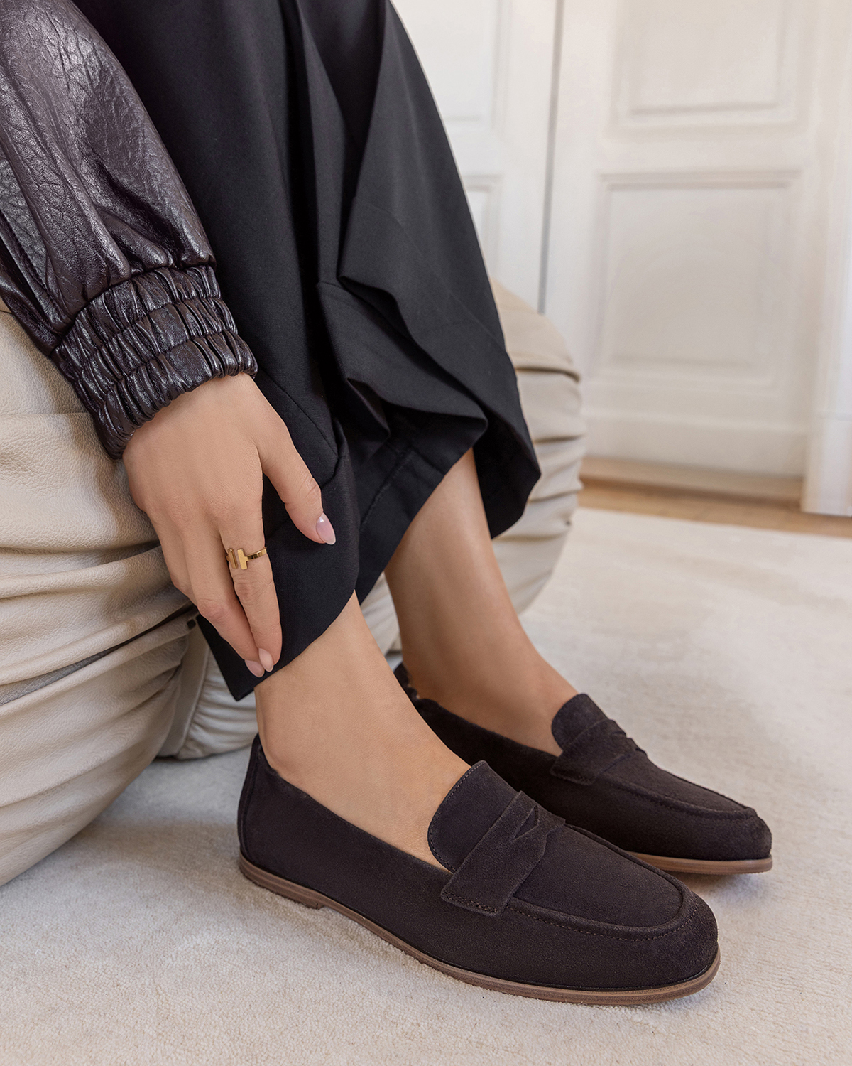 Czekoladowe mokasyny damskie ze skóry zamszowej