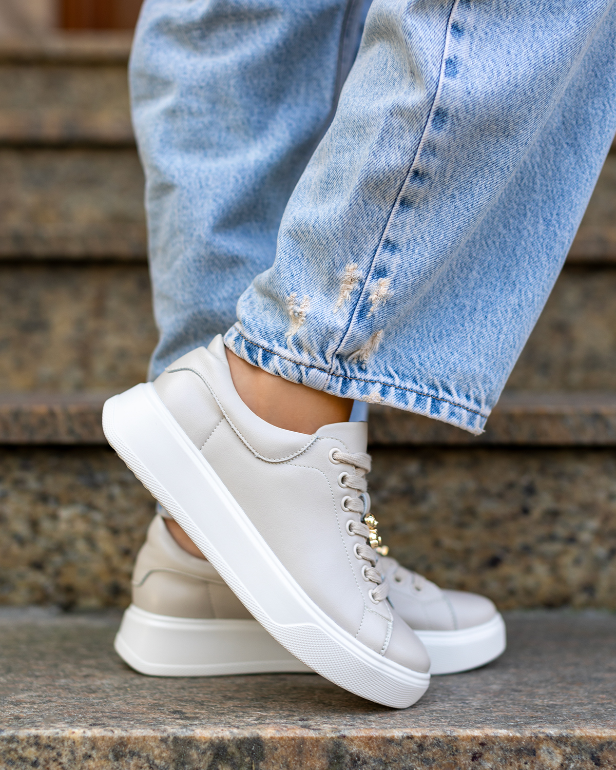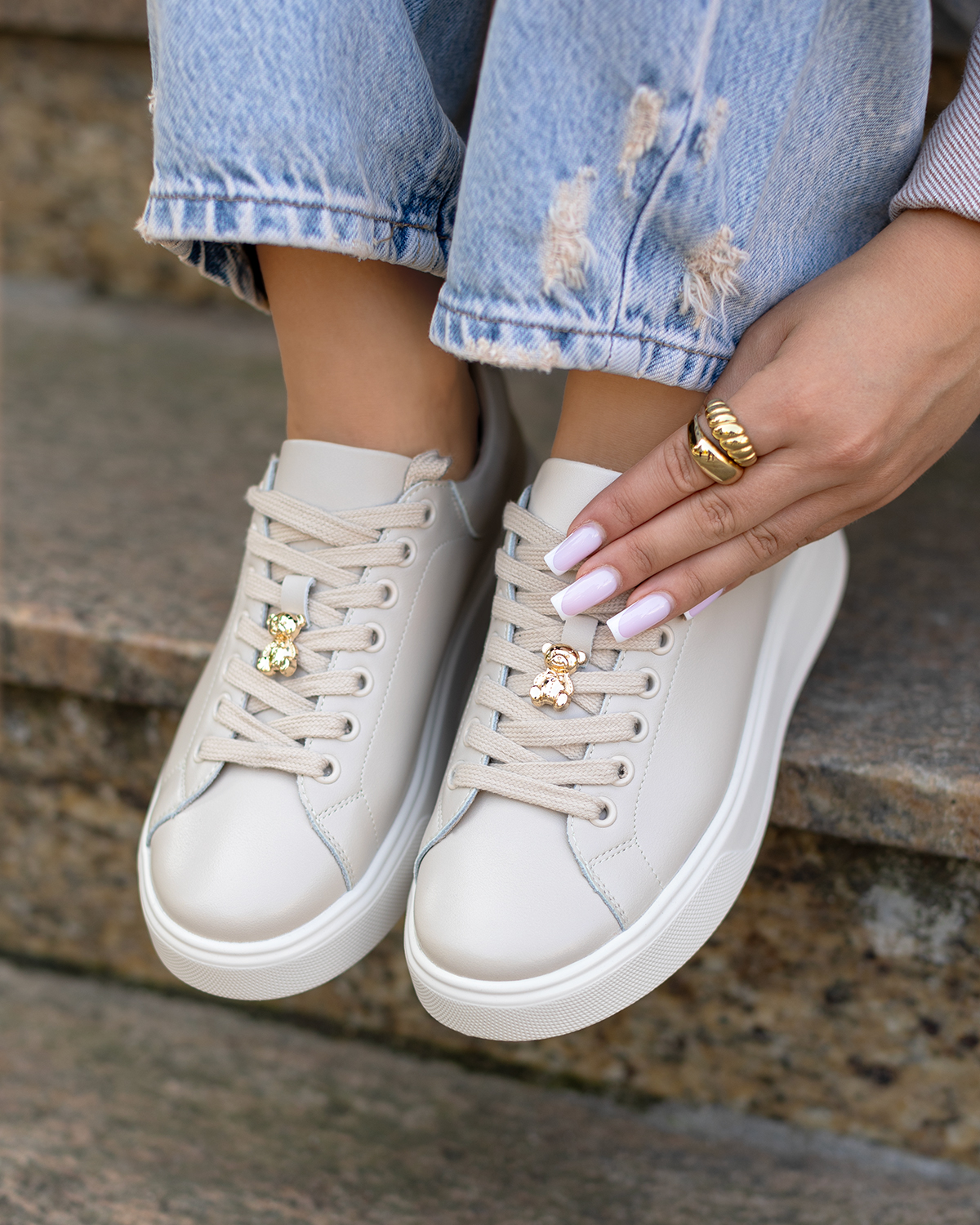 Jasnobeżowe trampki damskie wykonane z naturalnej skóry licowej to połączenie klasy i wygody w codziennym wydaniu. Ich subtelny kolor pięknie współgra z jasnymi i pastelowymi stylizacjami, nadając im lekkości. Miękka skóra o delikatnym połysku dopasowuje się do kształtu stopy, a efektownym akcentem jest urocza zawieszka w kształcie misia umieszczona na sznurowadłach – drobny detal, który przyciąga wzrok i nadaje butom niepowtarzalnego charakteru.