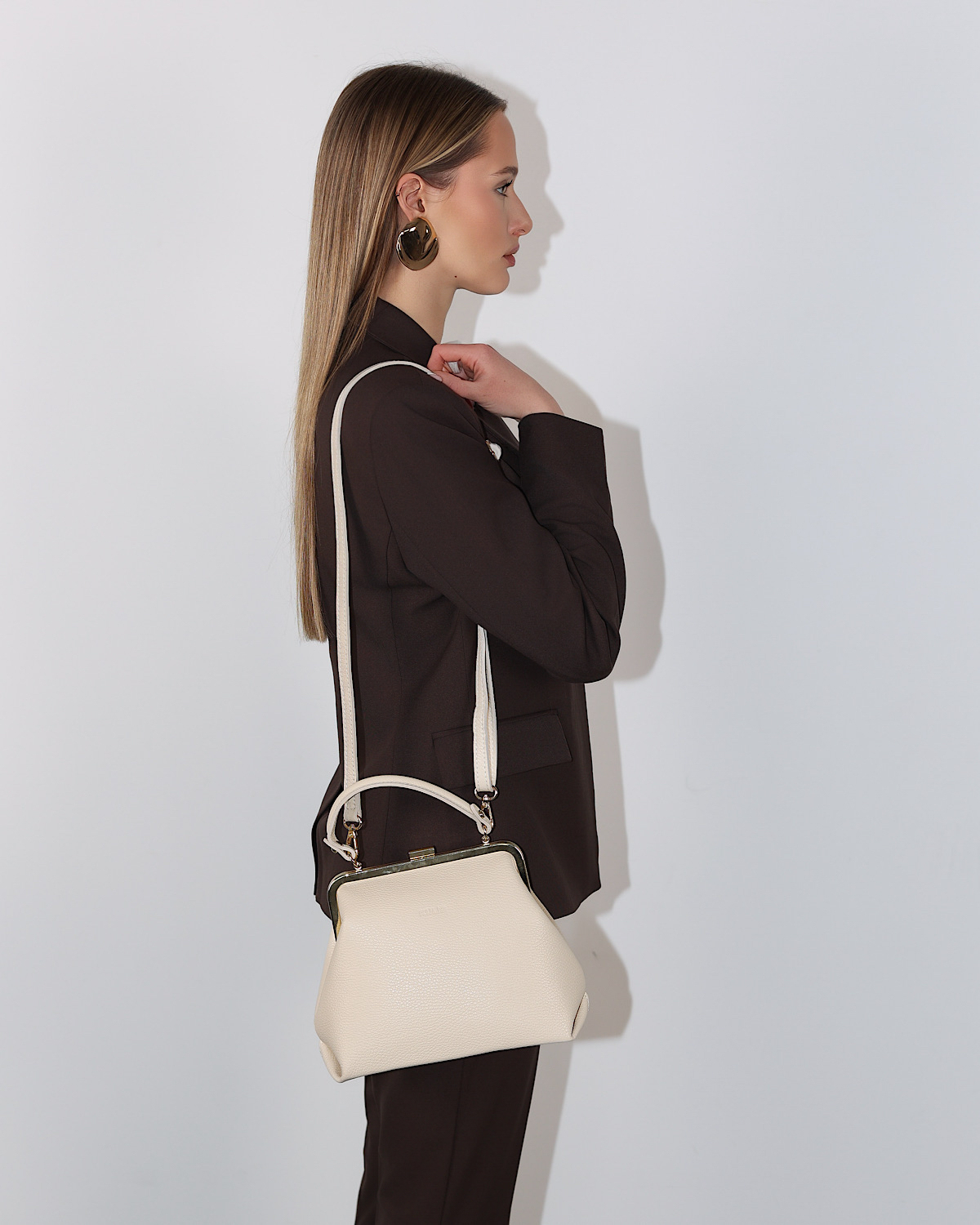 Kremowy kuferek damski ze skóry licowej na ramię