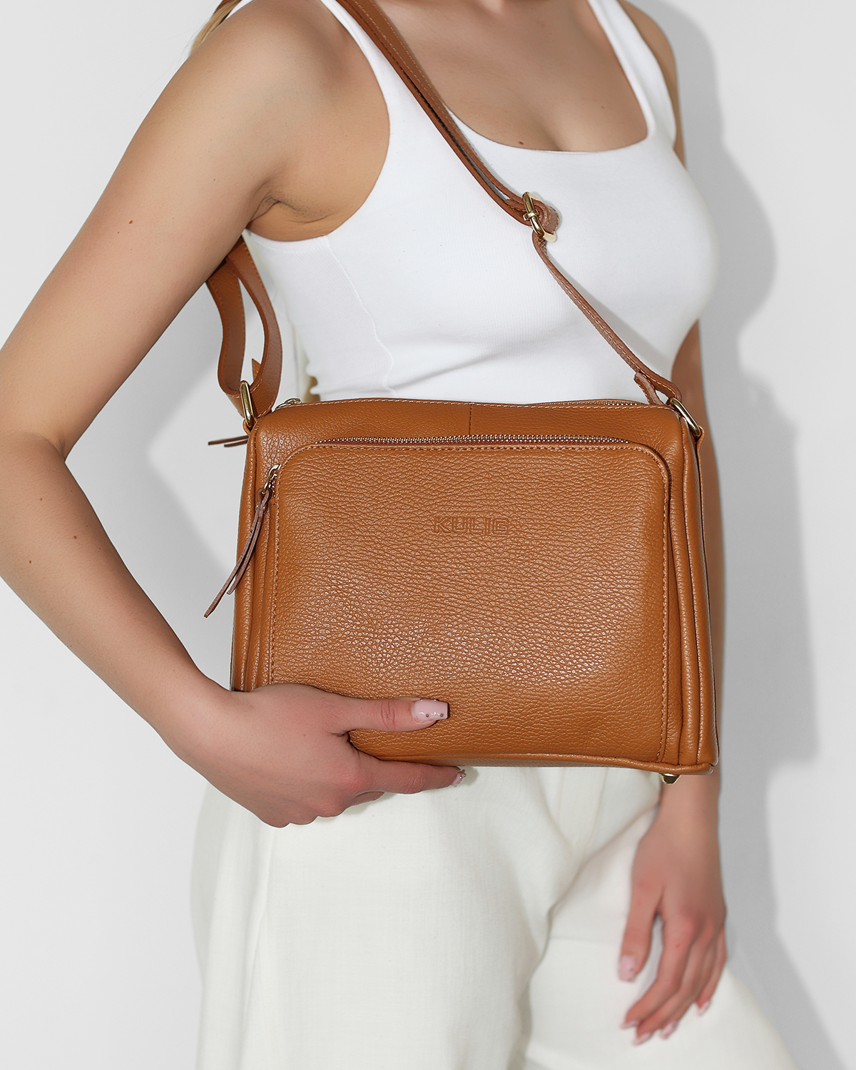 Pudrowa torebka damska ze skóry licowej