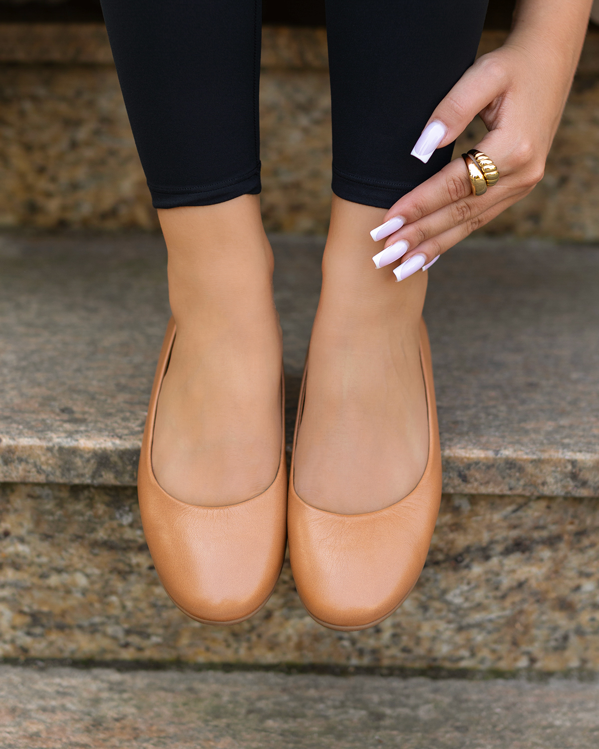 Złote baleriny damskie skórzane