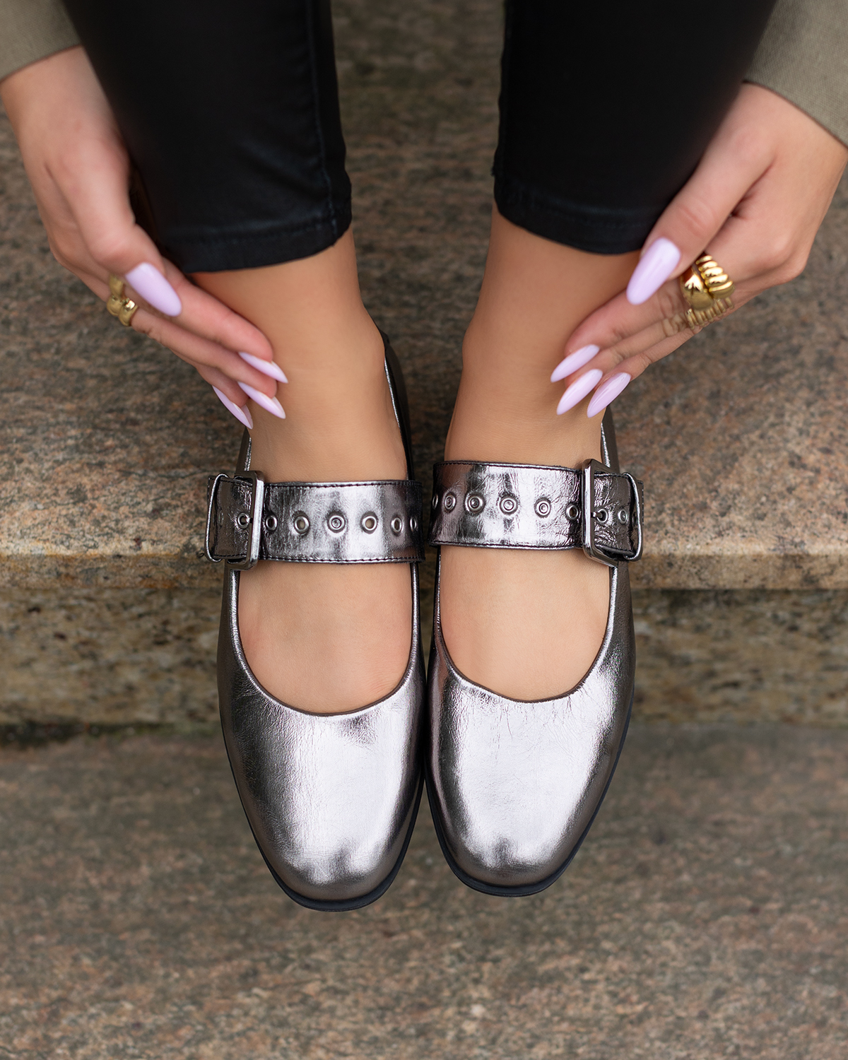 Srebrne półbuty damskie ze skóry licowej ze sprzączką 102-180-PEWTERSrebrne półbuty damskie ze skóry licowej ze sprzączką 102-180-PEWTER